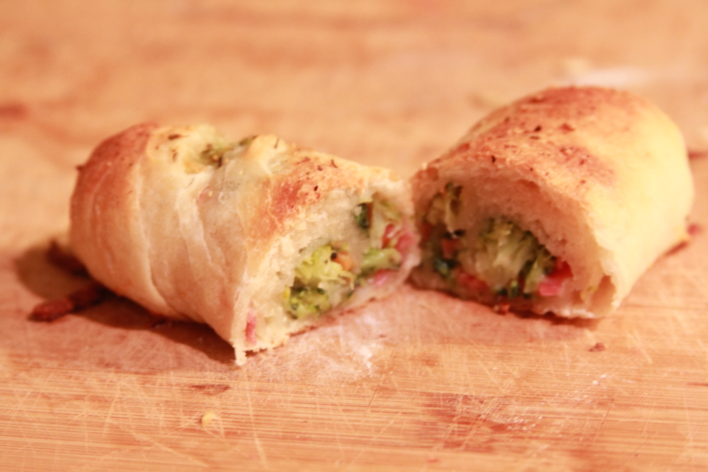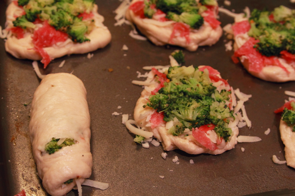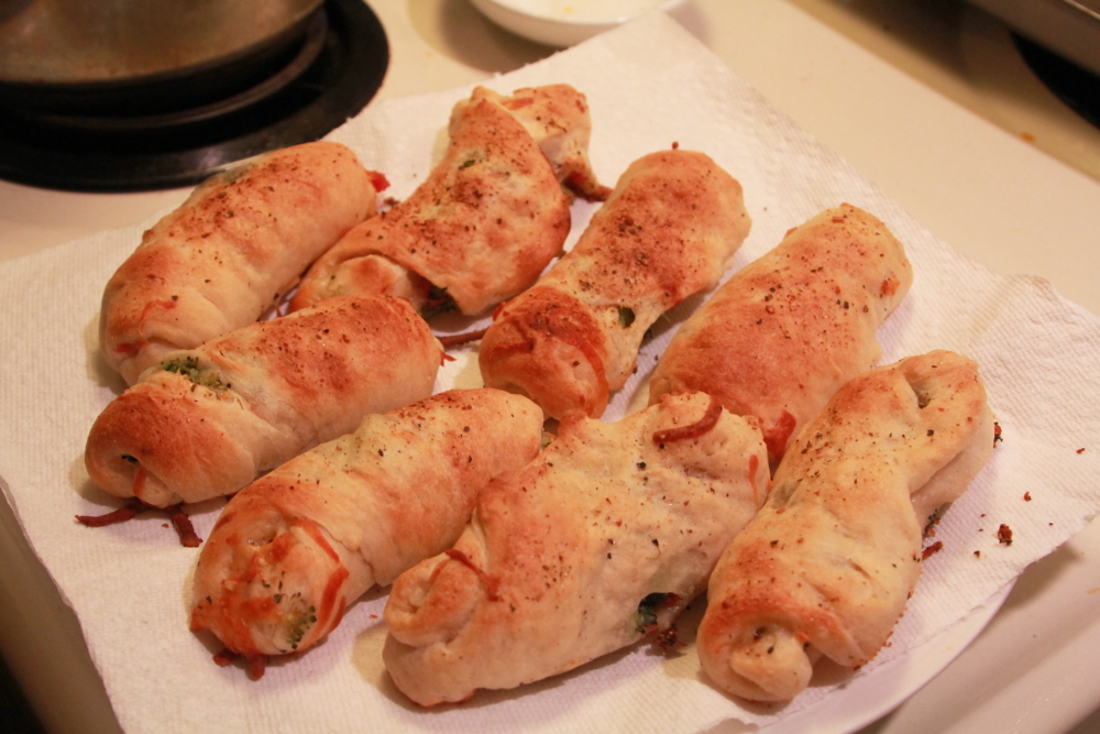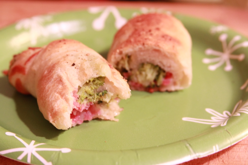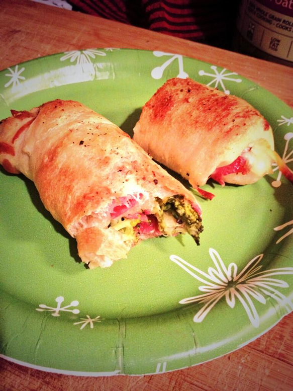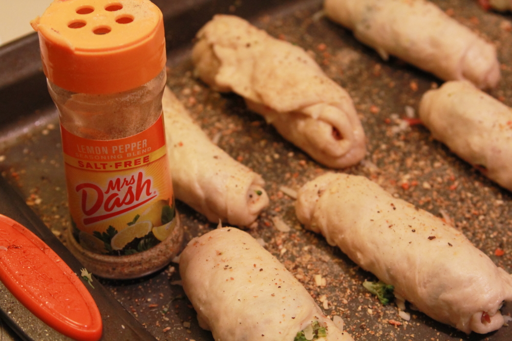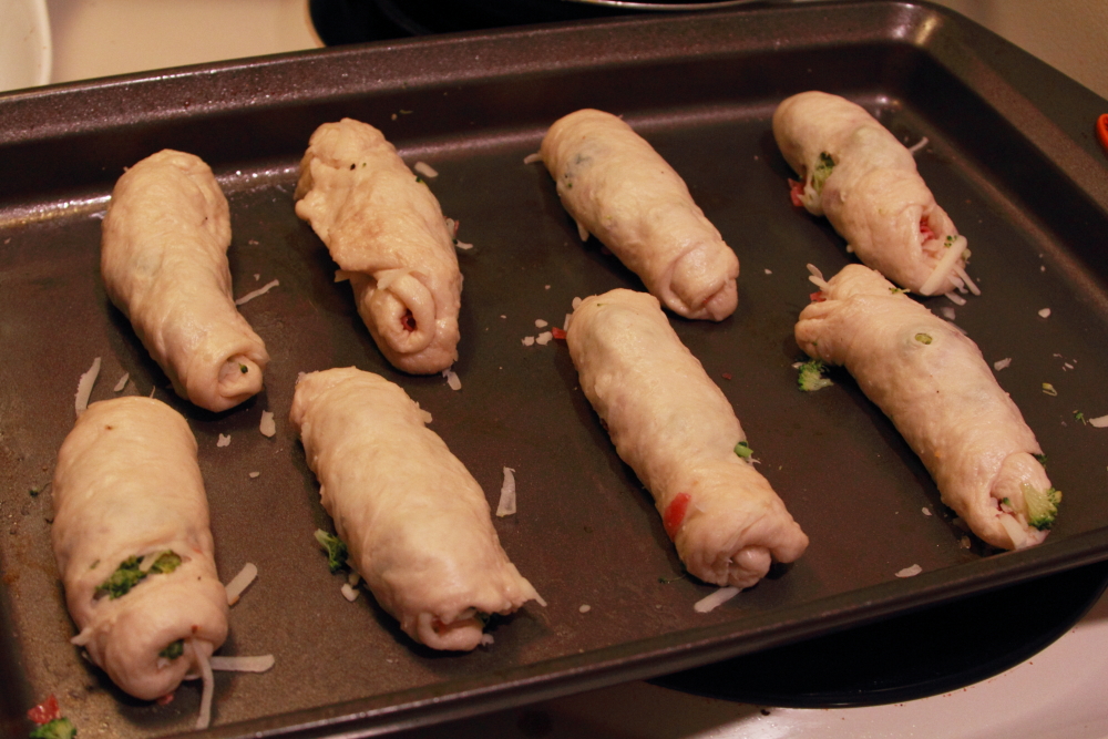 Now that all your layers are in place you are going to want to roll them now. As you roll them tuck the ingredients in so they are covered by the dough. Once you roll them completely make sure to squeeze them and put the fold on the bottom so that they don’t unroll in the oven. This dough sticks pretty well so you won’t have too many issues keeping things inside.