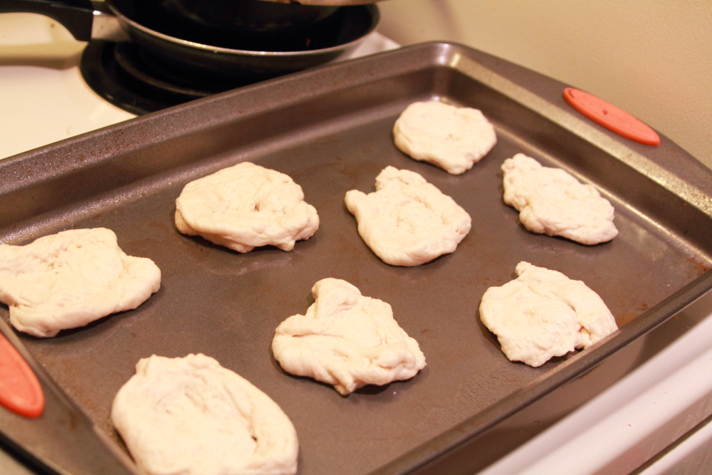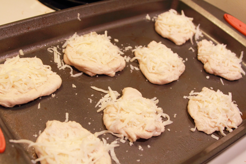 Put a small patch of cheese on each of the dough circles. Push the cheese down to stick to the dough.