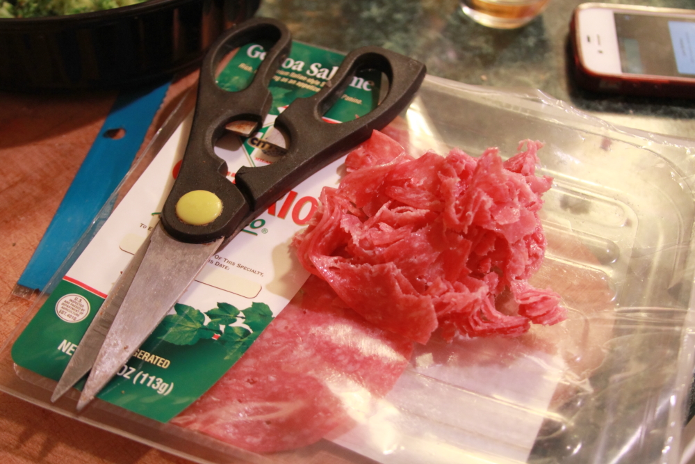 Take the salami and then cut it up into small strips or pieces. You can use a pair of scissors to do this very quickly.