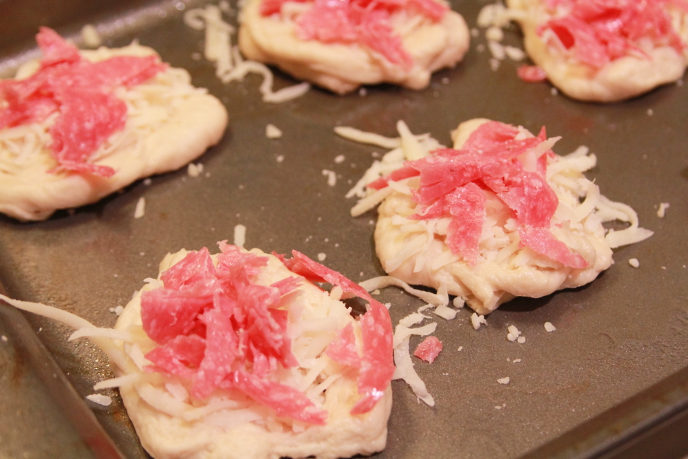 Add the salami as the second layer to the tiny dough balls on top of the cheese layer. Push down again, this helps things to start to stay in place.