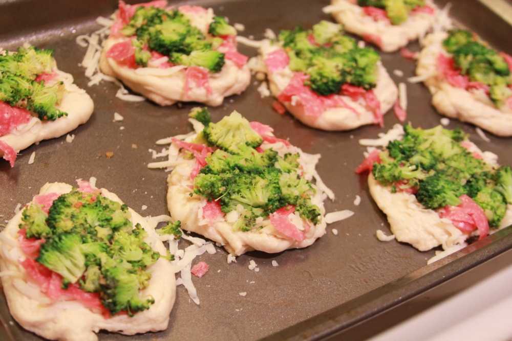 The last piece to add is the brocolli. I use a small spoon to scoop the florets out and put right in the middle of the dough balls. Again, pat everything down to stick the ingredients together.