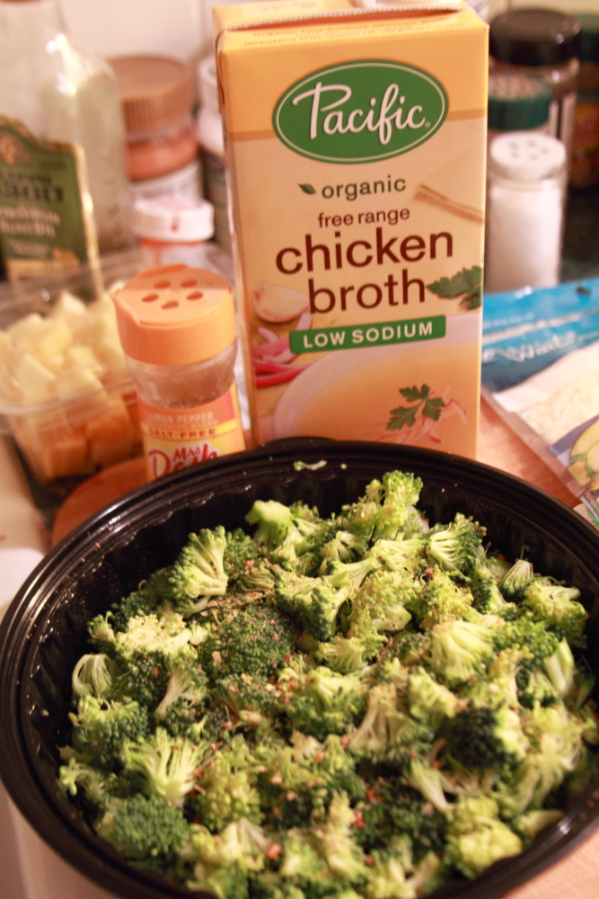 Put your brocolli into a microwavable bowl or dish and cut the florets down to finely chopped pieces. Pour in about 1/4 cup of organic low sodium chicken broth and shake on some Mrs. Dash seasoning then pop in microwave for 5 minutes to soften up the brocolli.