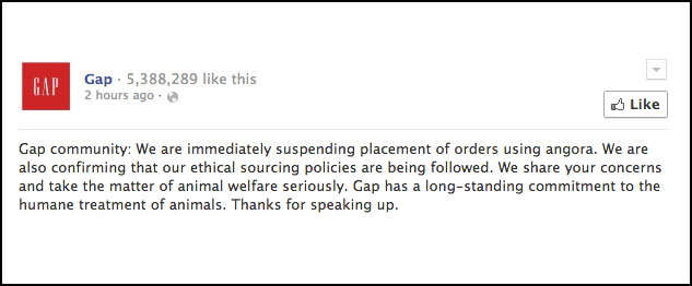 Thanks to your efforts, Gap announces that they will suspend all orders of angora fur. We want them to BAN it so that rabbits & consumers can breathe easy again!