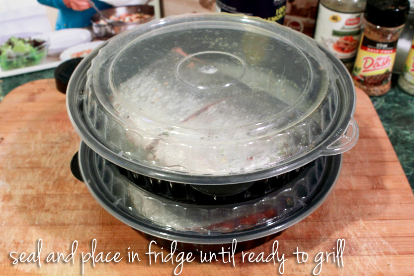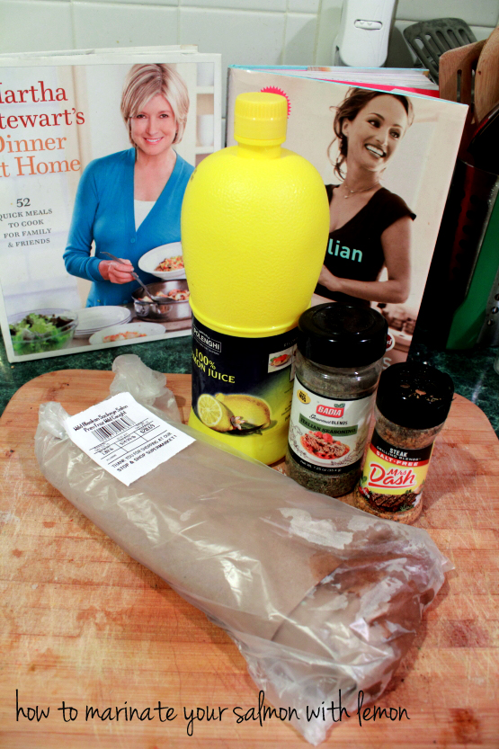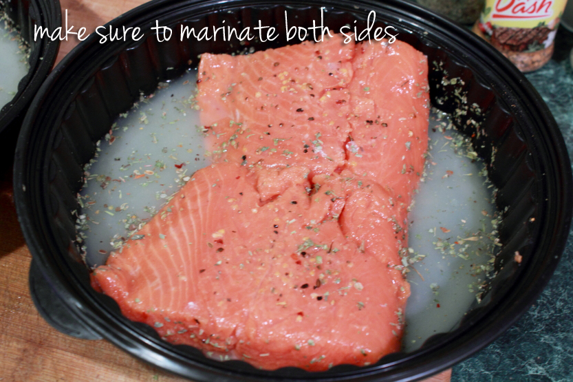 I coat a plastic container like this with just enough lemon juice to cover a tiny bit facing down. I add Italian Seasonings and the Mrs. Dash and then place the fish face down and leave it there for a few minutes.