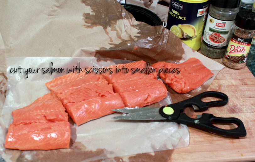 This was about 1.25 pounds of salmon so I used some kitchen scissors to cut this into four smaller pieces. These are actually quite large but they all fit nicely in my pan/skillet so this is a good portion size for each.