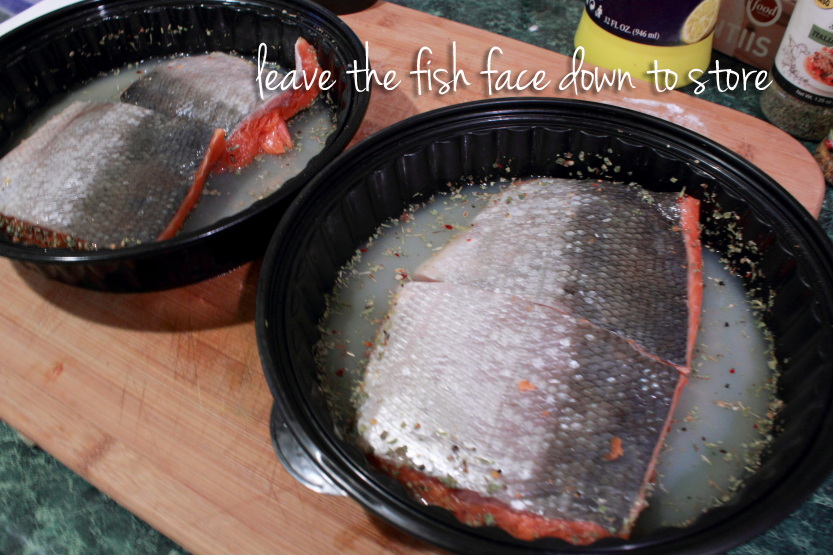 I flip to make sure the side with the scales gets some coating but then turn the fish back to the side with the meat facing down. This allows the flavors to be absorbed into the fish for cooking. I place a lid on these and then place in the fridge until I cook it. I never leave fish like this over night. If I buy fish today, I make fish today. I suggest letting this sit in the marinade 2-3 hours.