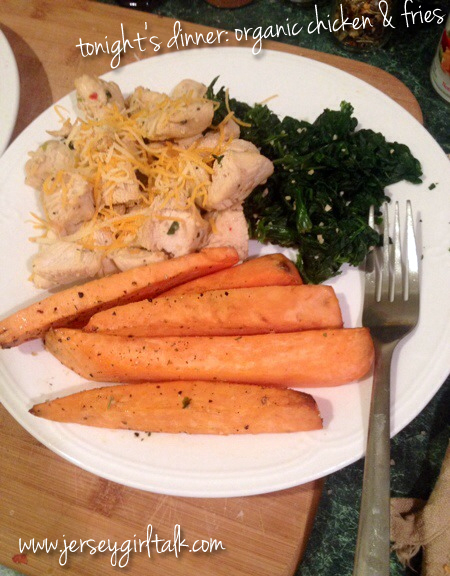 I am always making new dishes for dinner that are great sources of good carbs for energy, greens for fiber and for protein right now they only meat I eat is usually organic chicken breast or turkey/chicken ground meat. Tonight for dinner I used organic lean chicken, some sweet potato fries and spinach with onion and topped my chicken with Organic Valley mexican shredded cheese. It was delicious!