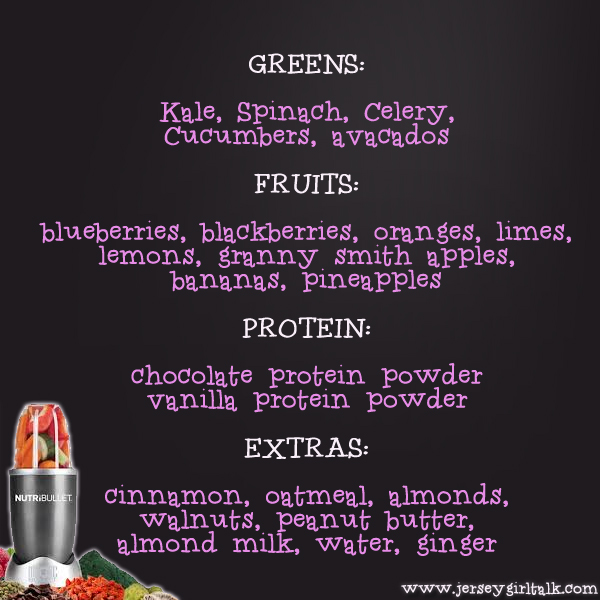 My Nutribullet is the silver one and it comes with the two smaller cups and one large one. This is great to make a shake for the morning and one for the afternoon. I make two shakes in the morning and put one in the fridge for later. I usually make one in the morning that is more greens and fruit based and the one in the afternoon is more of a protein smoothie. This allows me to get both types of flavors: fruit and sweet. Below is a great grocery list to have what you need to make your Nutribullet recipes:
