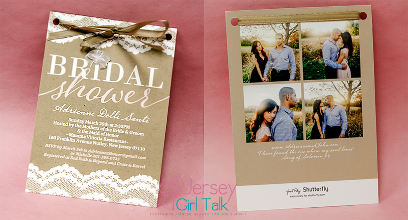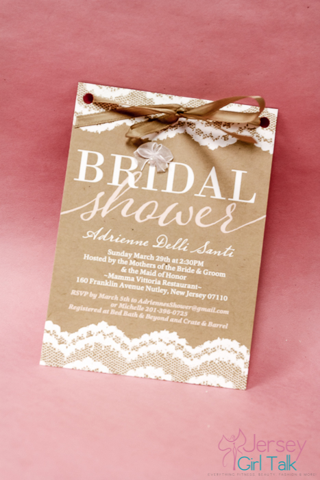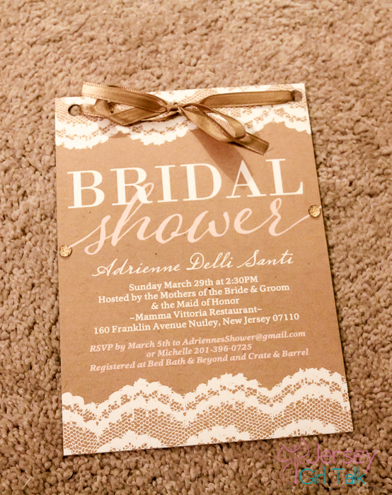 I ordered my original bridal shower invitations from Shutterfly, which offered great coupon codes and service. I found a like tan colored invitation with white lace trim and some pretty light pink script font. This matched the tone I wanted for my shower and matches my wedding colors as well. I was able to adjust the font colors, text and also able to add photos on the back with a quote we love for no additional charge. I liked the idea of adding images to the back of the card to include my fiance somehow. While a shower is about the bride, it should also speak a little bit about your groom and your relationship. I liked using this design to make it more personal and thought it was so pretty!