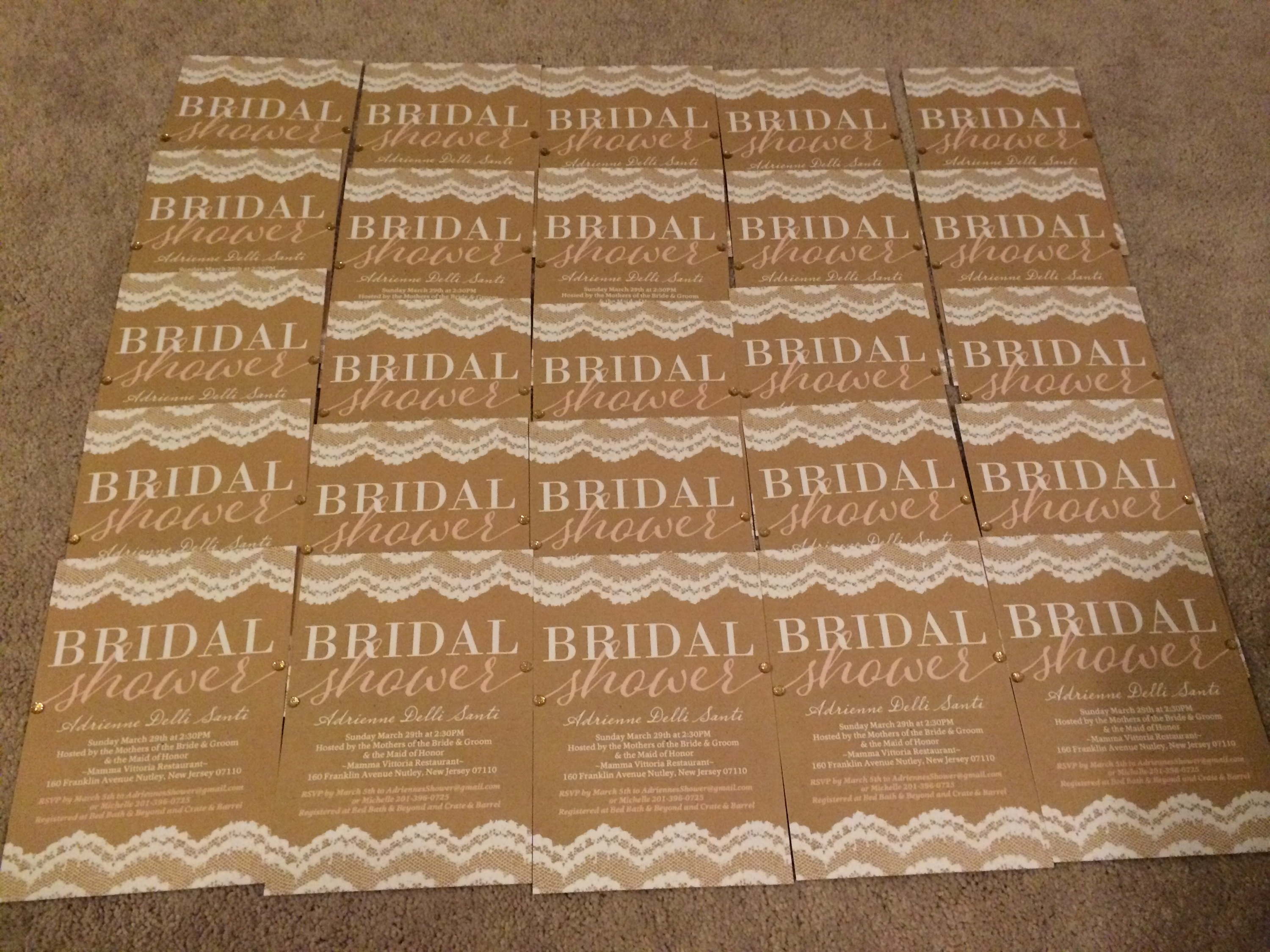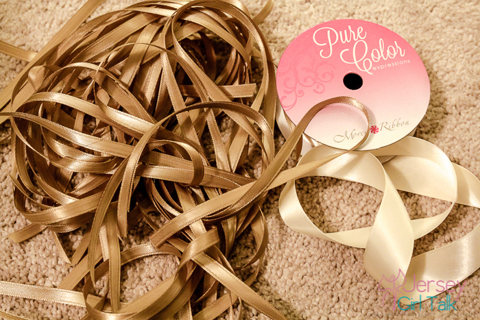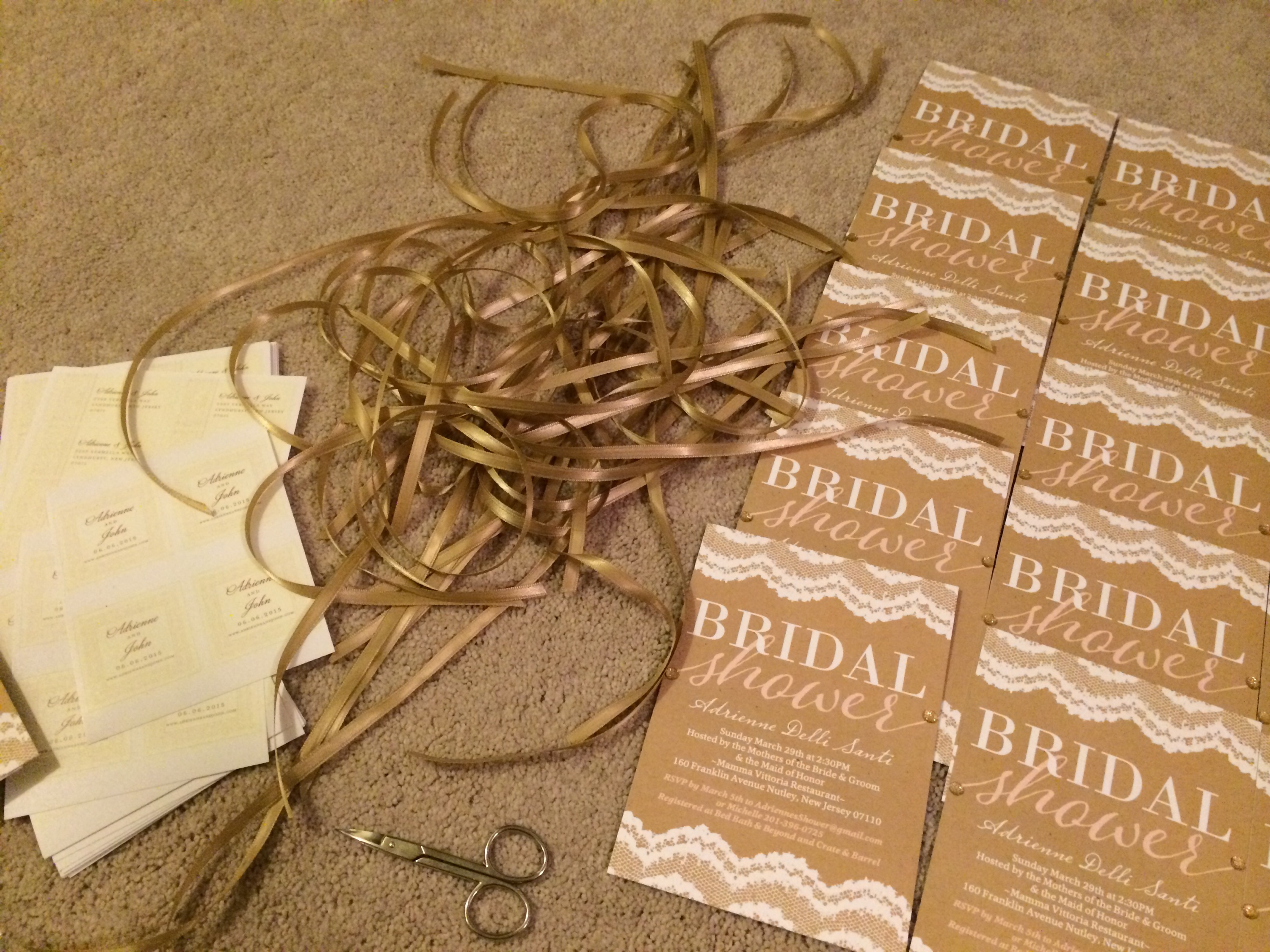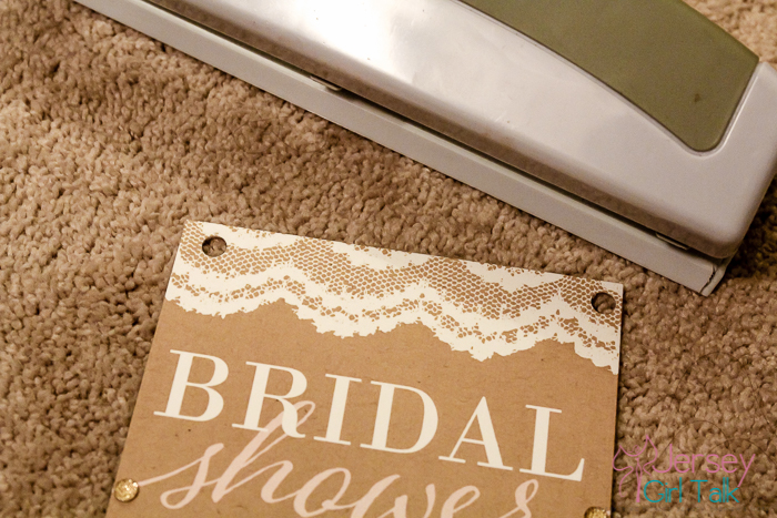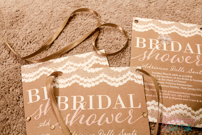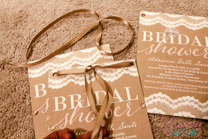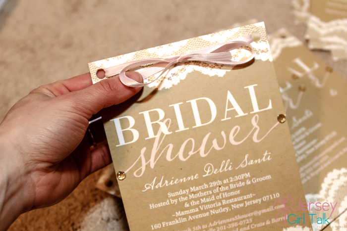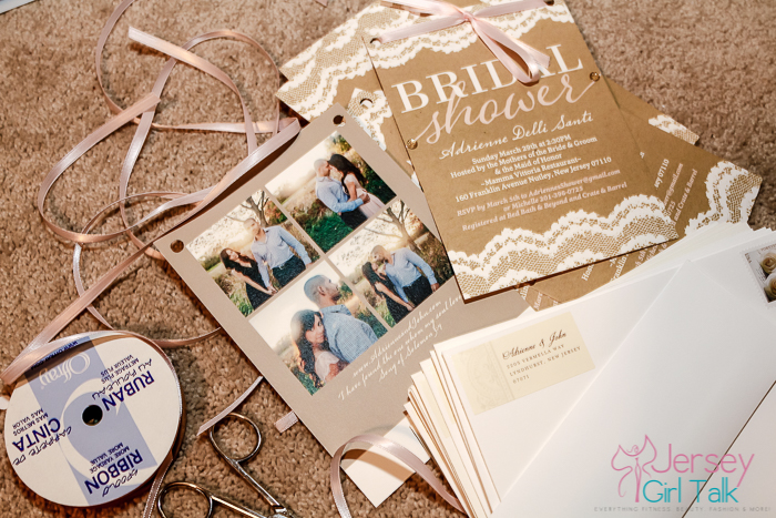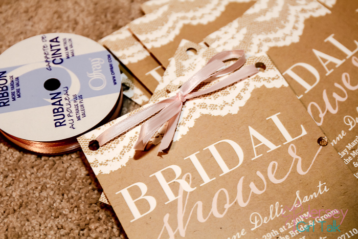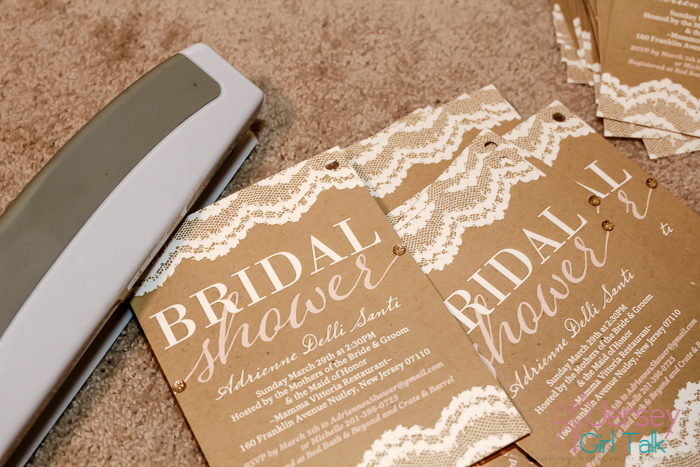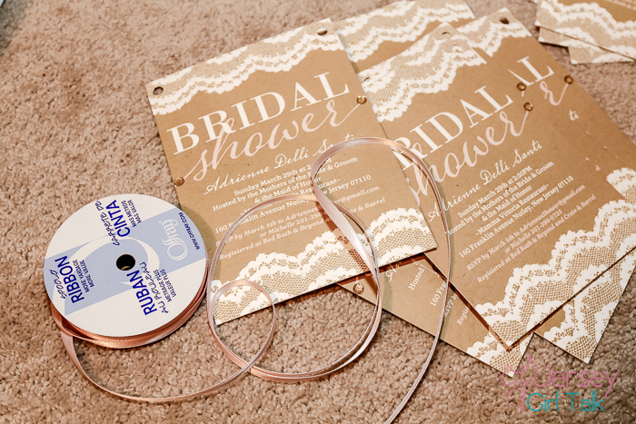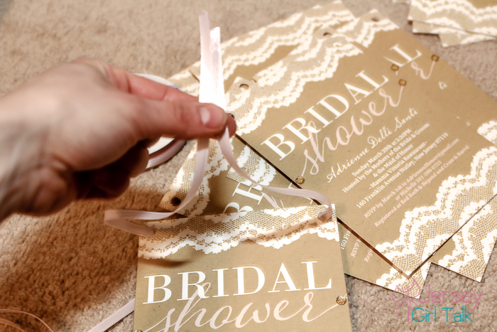 The next step was figuring out how to apply a ribbon to the invitation. I tried at first to use some glue dots to hold them into place but that wasn’t working out too good. I came up with the idea to use a hole puncher on the top area, laced the ribbon through and tied it on the top. I did half in a brown color and half in a baby pink to match the script. This was a feminine, pretty touch to the invitations.