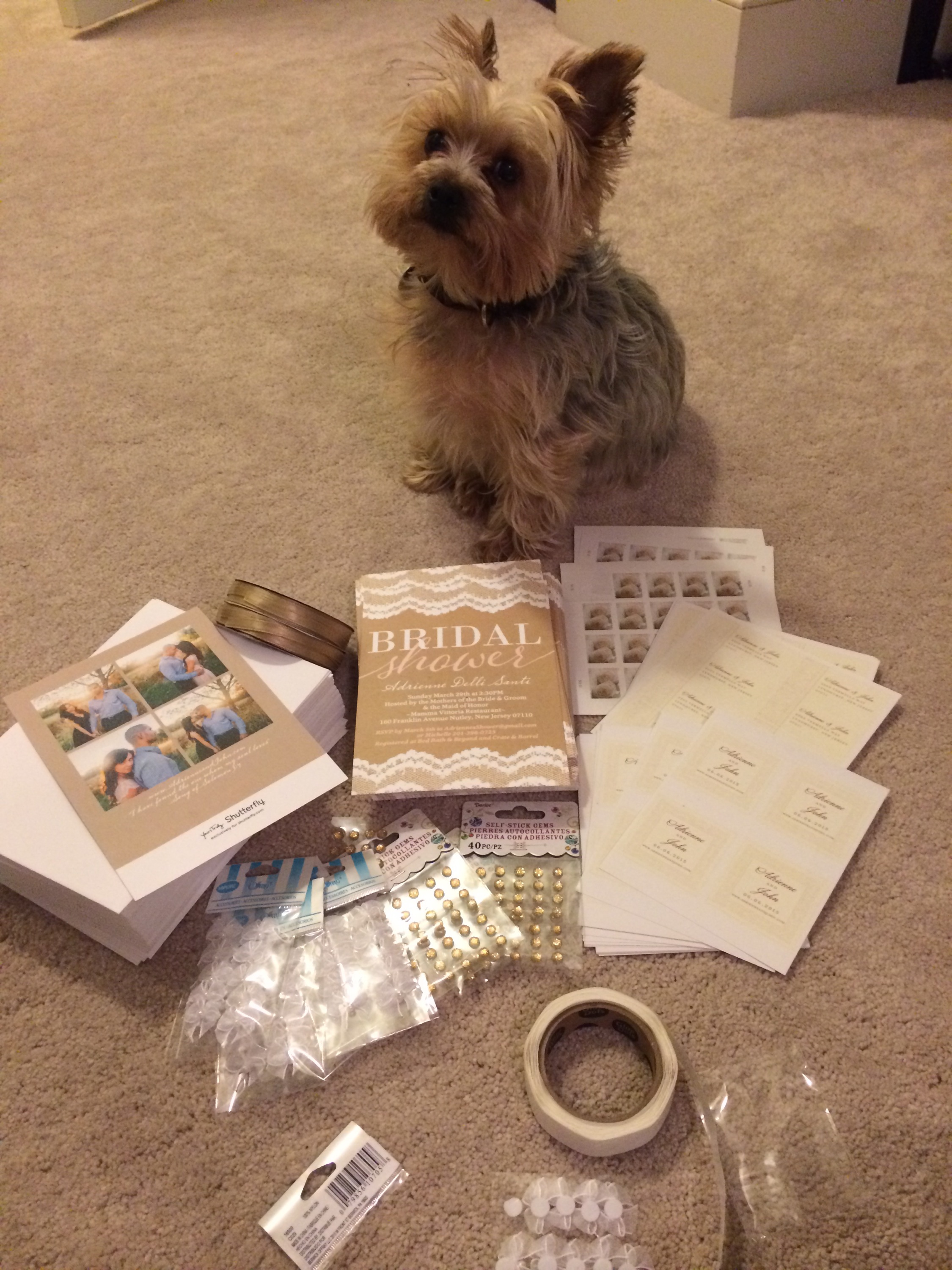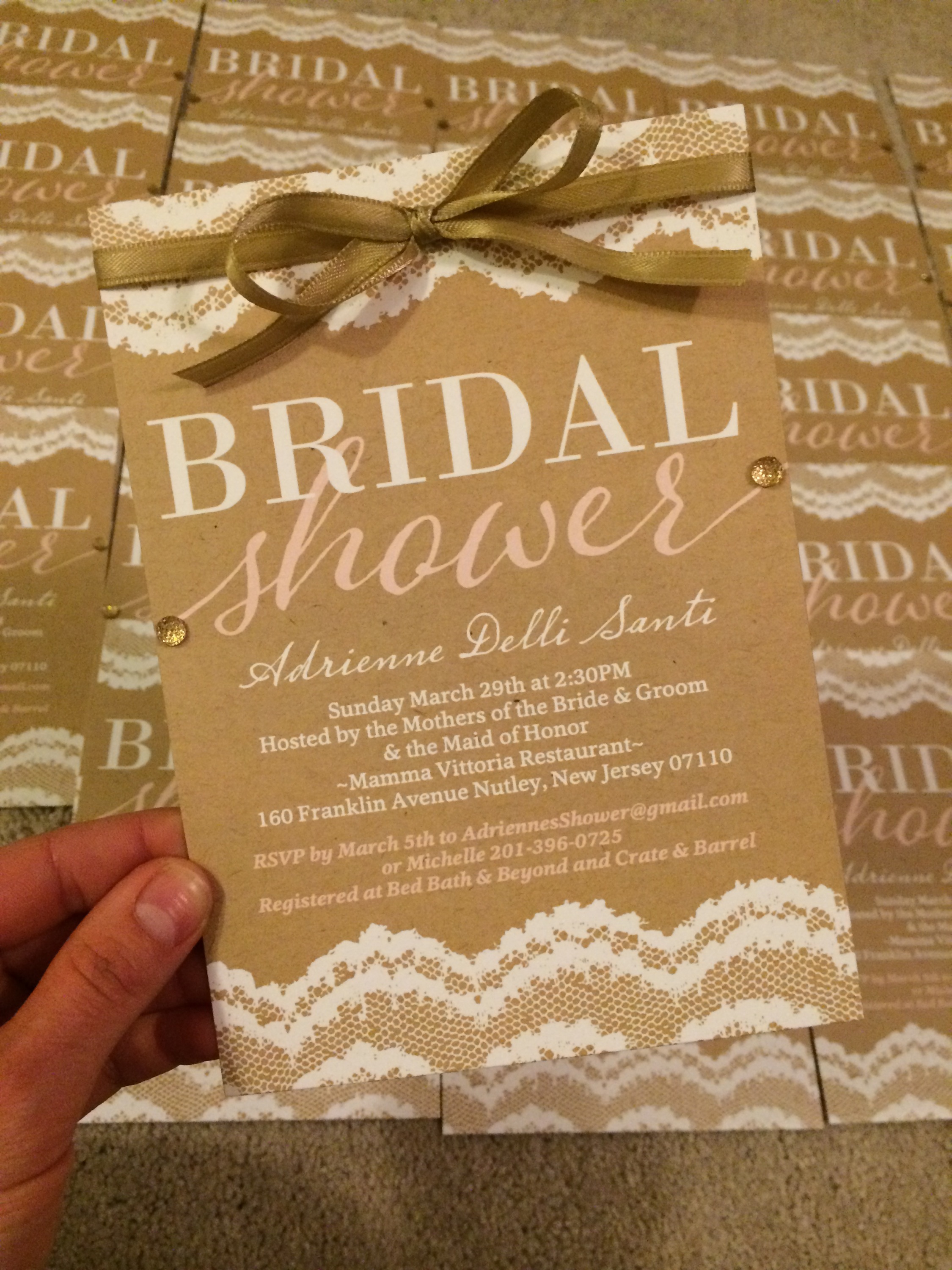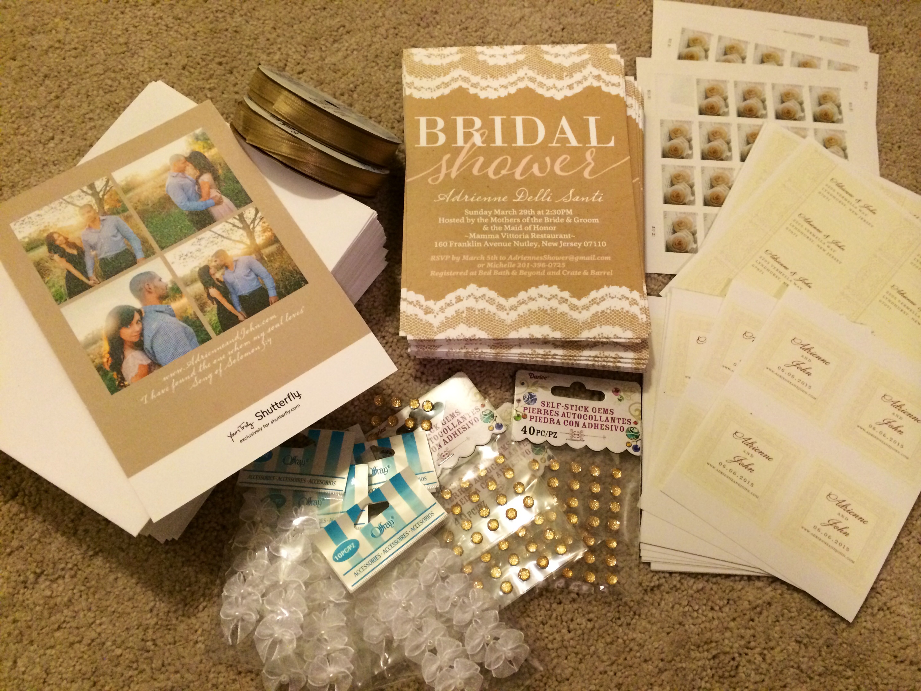 What I wanted to do was to add some fun accents to my invitations so I bought some gold sparkling self stick gems, some white tiny bows, some pink and some beige ribbon, a hole puncher, and then I also used the self address stickers that I purchased to match my wedding invitations and used those for my shower envelopes. The first step was to apply the crystal gems, which I put on the beginning of the word “Shower” and the end of the word as well. That added some sparkle and flair to the center of the invitation. I still thought they needed something more though…