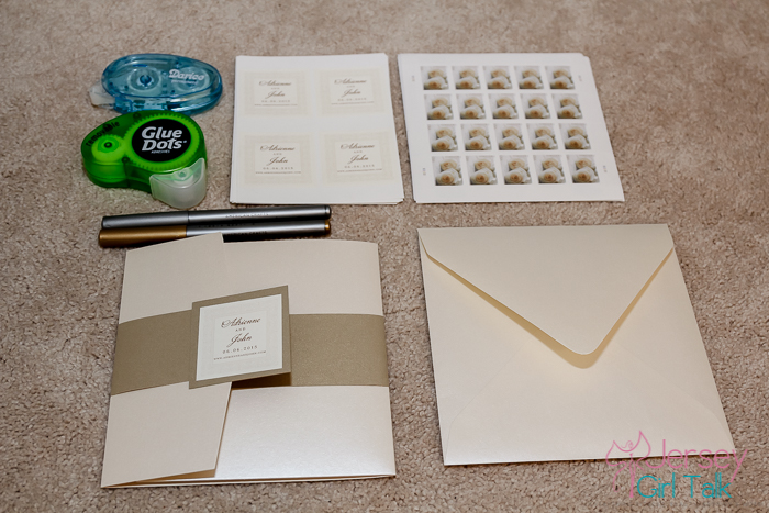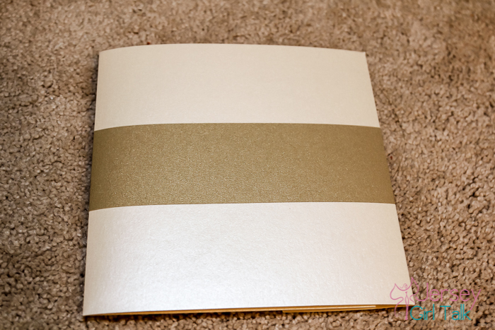 These cost me an addition $150 total for the pocket and the new outer envelopes. The color matched perfectly and it added that touch I was missing. The next thing I needed though was a way to decorate the pocket so I ordered Leaf Gold belly bands from the same website (link here). I then ordered some square backing paper in the same color to attach a sticker too. In my original invitation suite I had ordered matching gift tag stickers, which were perfect to use on my belly bands! These I got from Wedding Paper Divas as well (click here). The belly band tied the entire look together perfectly, I couldn’t be happier with how these came out. The belly band goes around the entire pocket and I used a glue adhesive tape all around to make sure these would stay in place. I recommend using either of these two options: