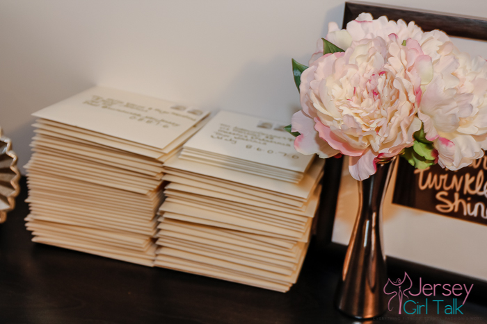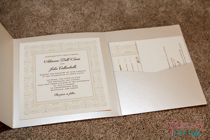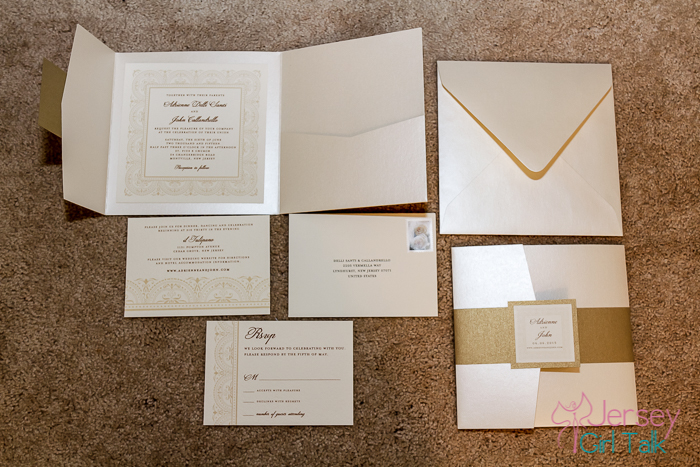 When it comes to choosing colors for your invitations most websites have the option to choose your colors. I wanted my colors to be gold, champagne and blush pink. As I started to look online a lot of the invitations did not offer a lot in the pink color palette so I went with something that was ecru, gold and cream. You don’t have to pull all of your wedding colors into your invitations suite, maybe one or two to tie it all together. Also when ordering your invitations you may want to get some samples of colors as well of the paper stock which can let you see how they look in person under different light.