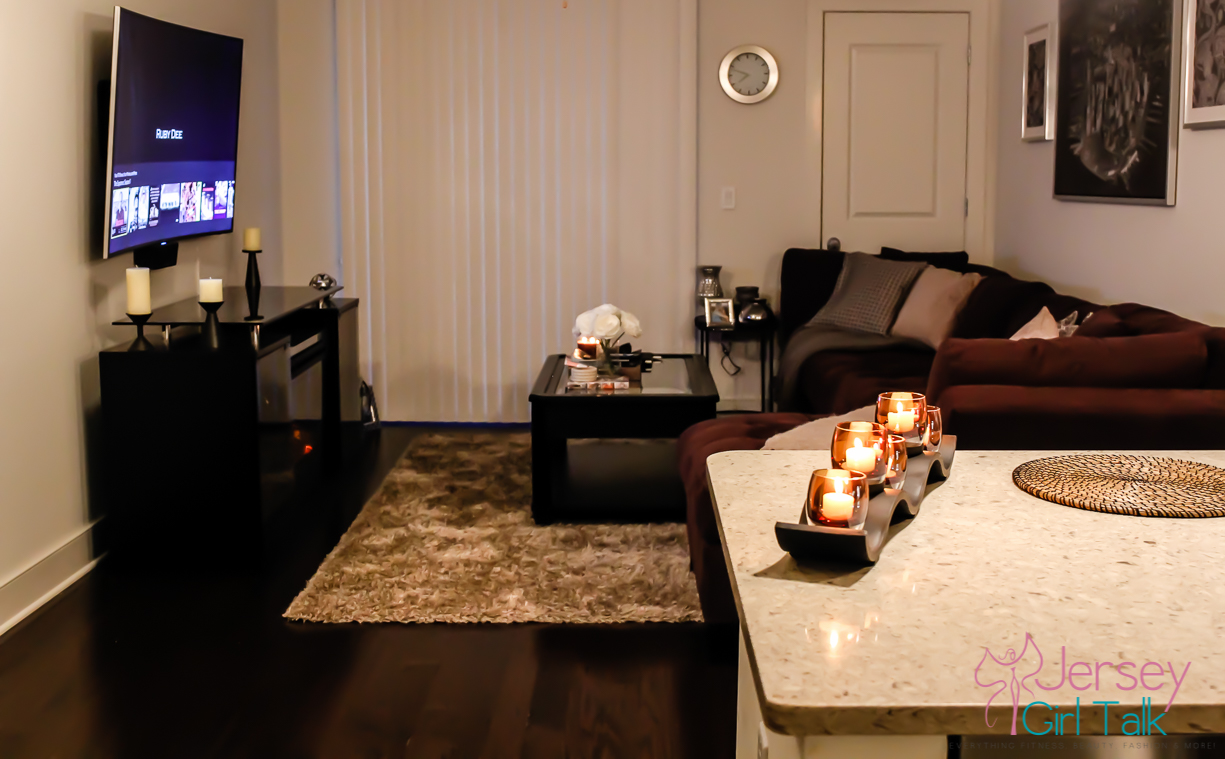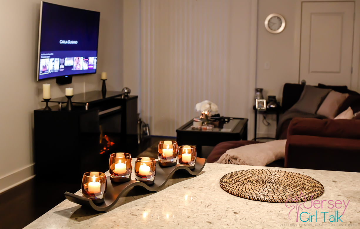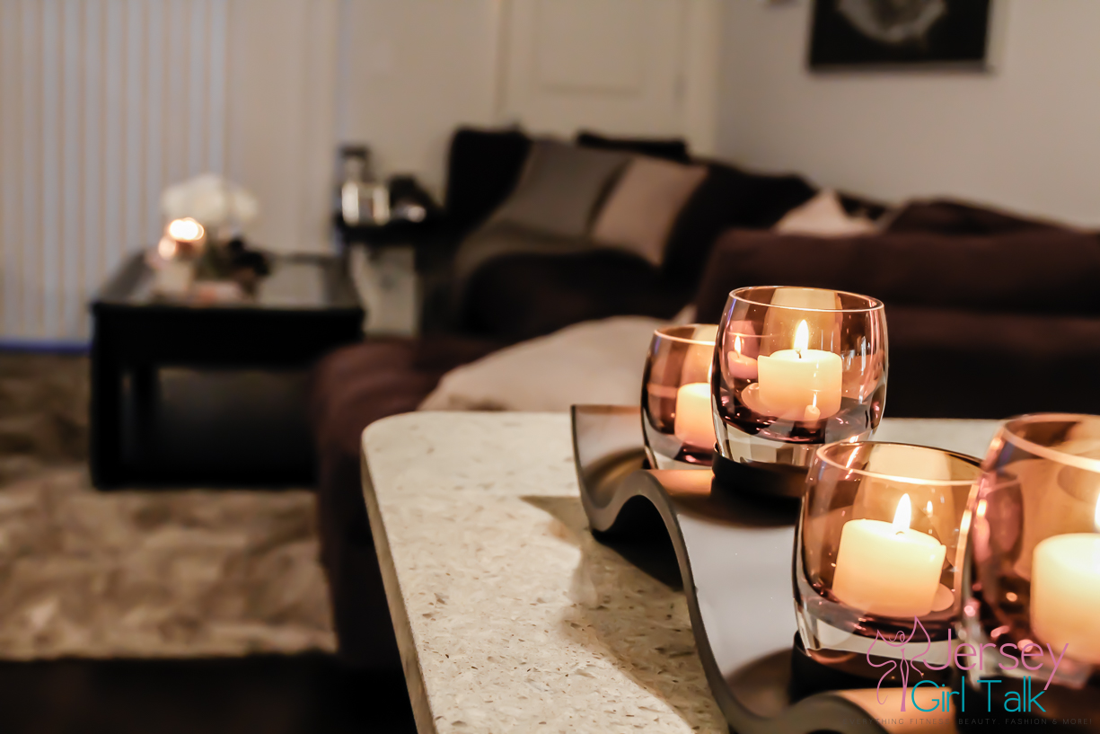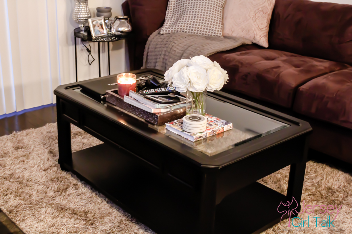 We got our rug from a local Home Goods and loved the lighter grey high pile style. Our little dog, Lola, loves a very soft rug to lay on to sit and lay in the sun or chew or bones. Plus since she likes to jump off the couch we made sure to get a high pile to cushion her landing on her tiny legs. We decorated our living room with lots of cream, silver, light grey, charcoal and black colors. A few items we love to have in our living room include candles, candle holders, books throw pillows, throw blankets and photos. I got a lot of my decorative items at Home Goods, TJ Maxx, IKEA or from Amazon online too.