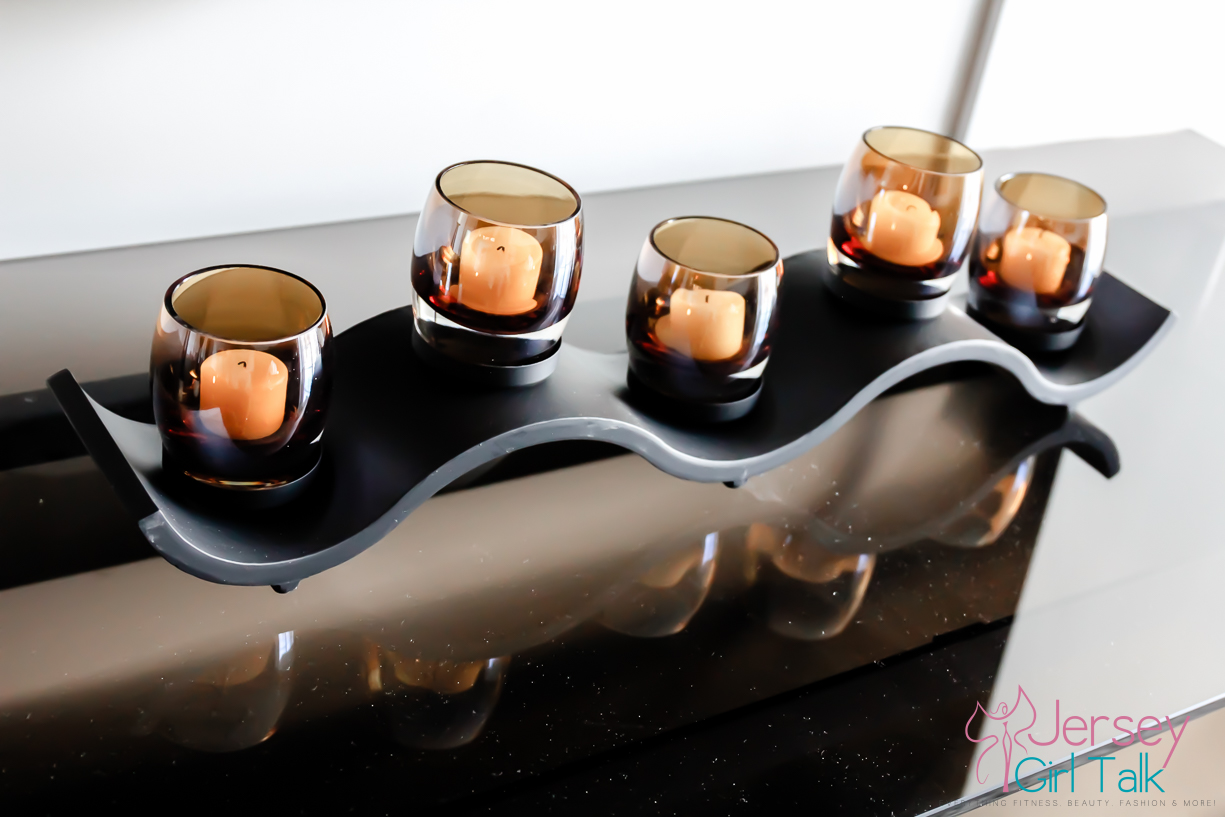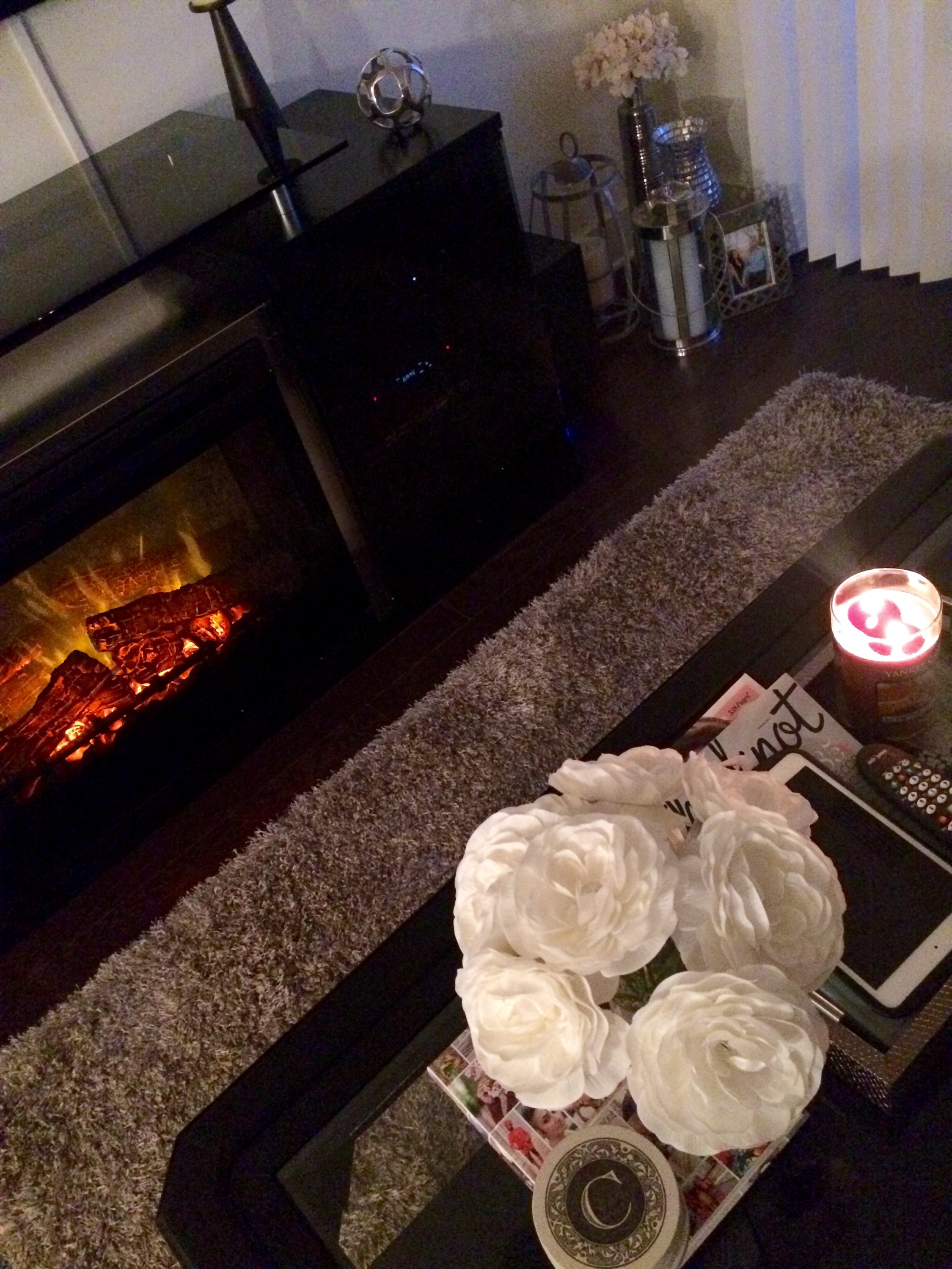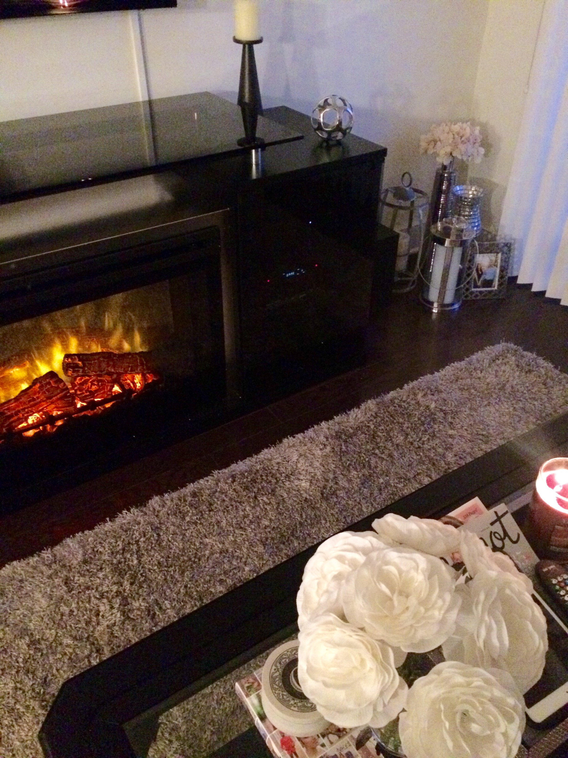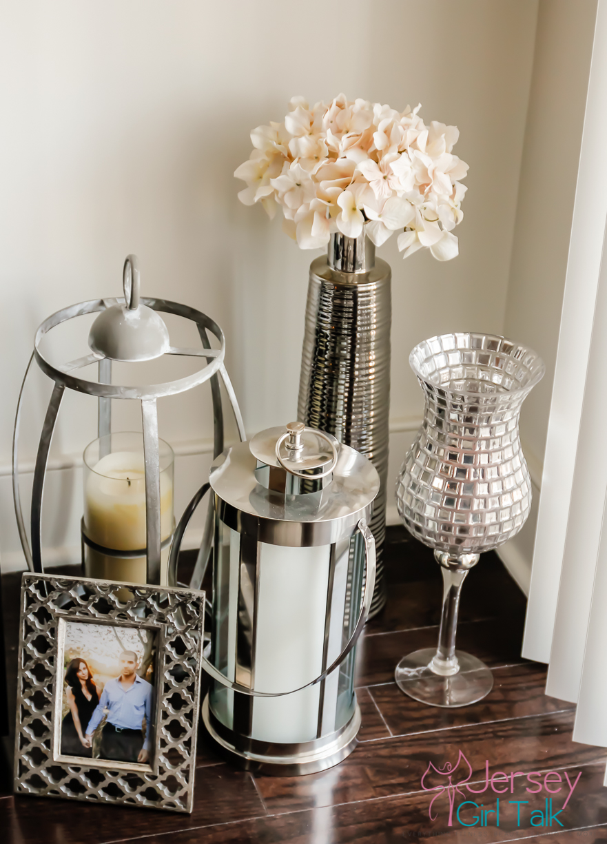 We got our rug from a local Home Goods and loved the lighter grey high pile style. Our little dog, Lola, loves a very soft rug to lay on to sit and lay in the sun or chew or bones. Plus since she likes to jump off the couch we made sure to get a high pile to cushion her landing on her tiny legs. We decorated our living room with lots of cream, silver, light grey, charcoal and black colors. A few items we love to have in our living room include candles, candle holders, books throw pillows, throw blankets and photos. I got a lot of my decorative items at Home Goods, TJ Maxx, IKEA or from Amazon online too.