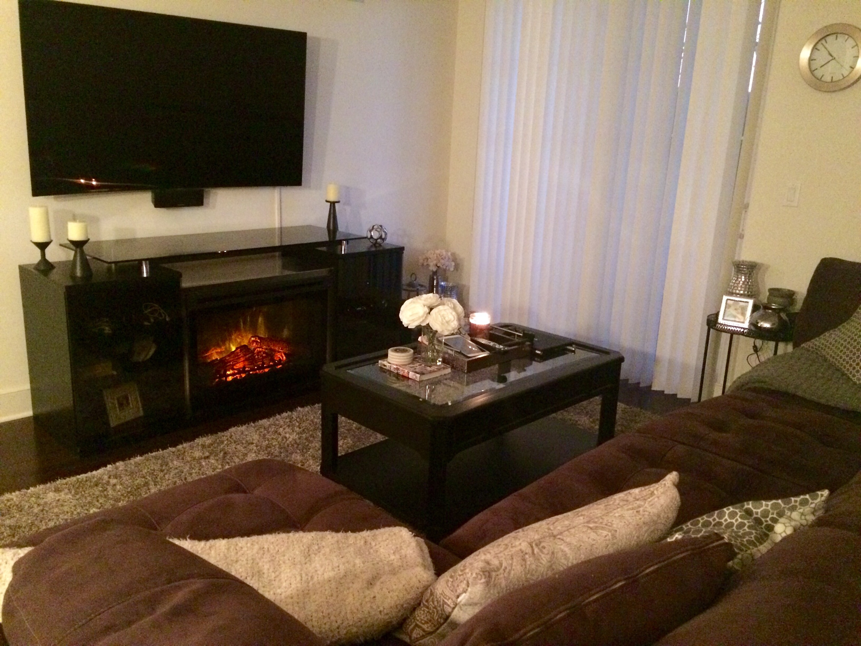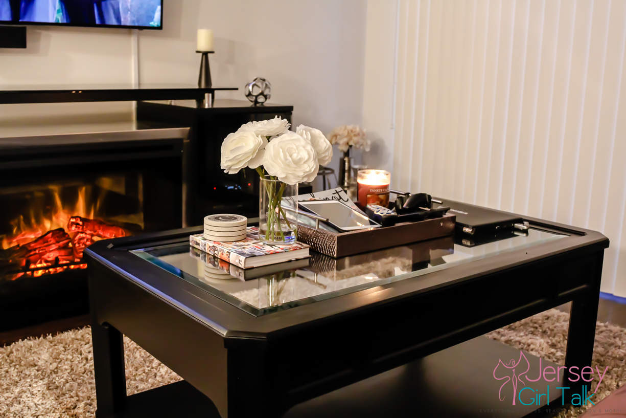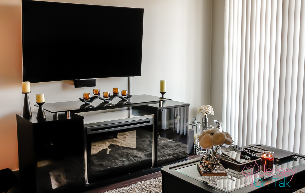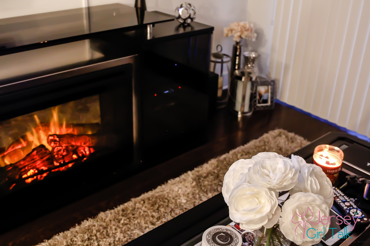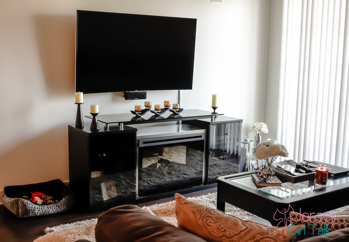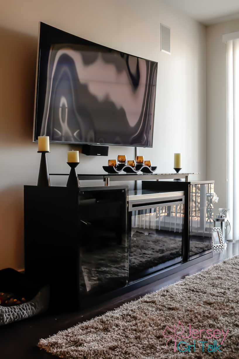 After we now had our main pieces in the living room it was time to start to accessories and make it feel much cozier. We LOVE the way the fire place unit looks in our living room. It is 76″ long so it fits nicely under our wall mount flat screen tv. We have the large Samsung curve TV and the fire place unit is right underneath at the perfect height so nothing had to be redone with the placement of our tv. The cabinets have tons of space to hide cable boxes, Playstation and DVDs and the black finish matches our colors perfectly. Do you know how hard it is to find a black media unit like this? It was like a needle in a hay stack so we were thrilled that we chose this unit.