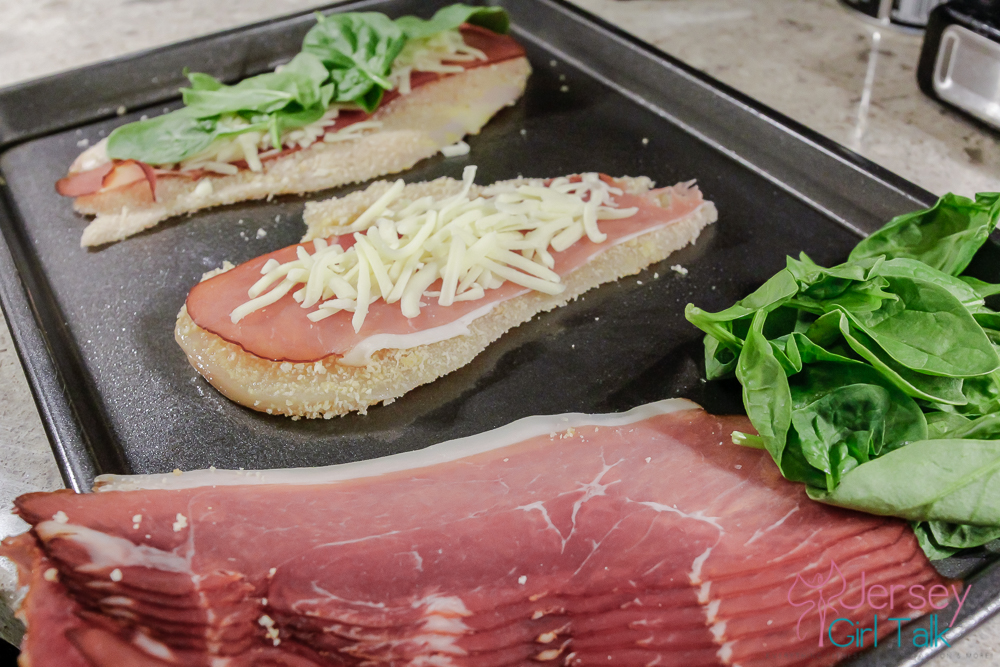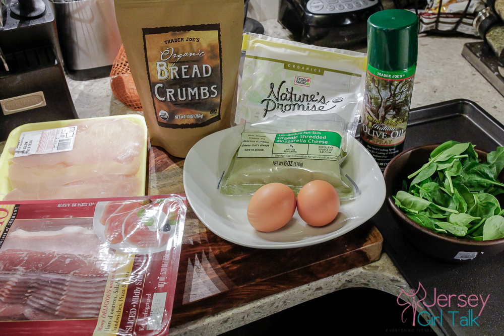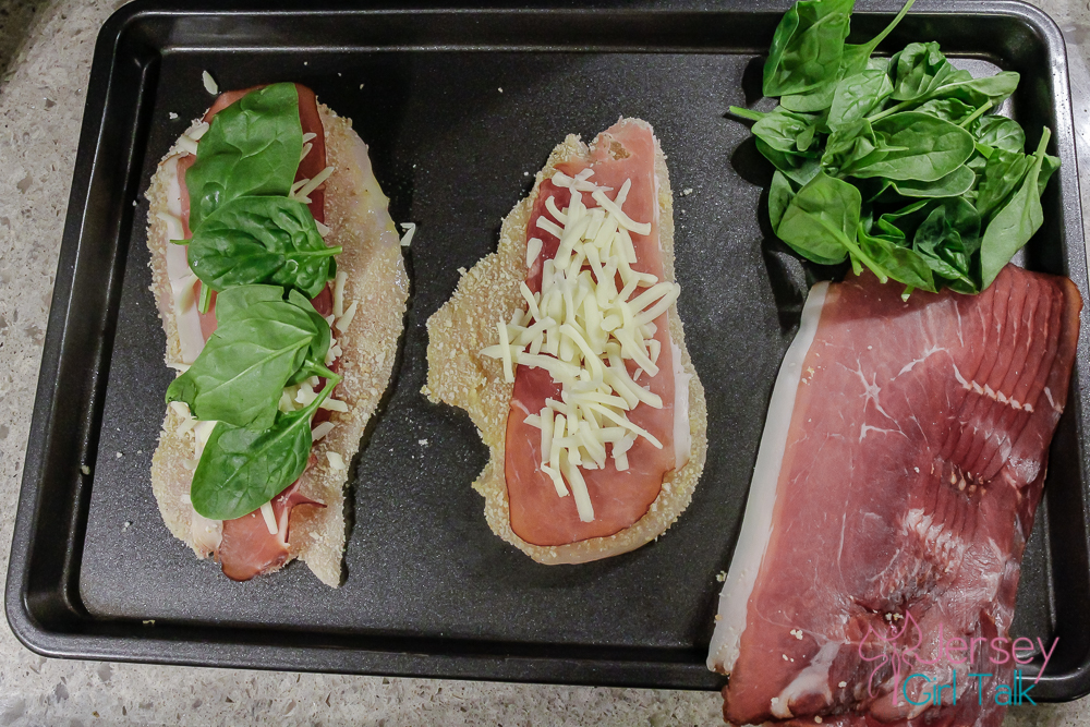 → lay the coated chicken breast on the pan and then place 1 piece of prosciutto, a handful of shredded cheese and then a few pieces of spinach
