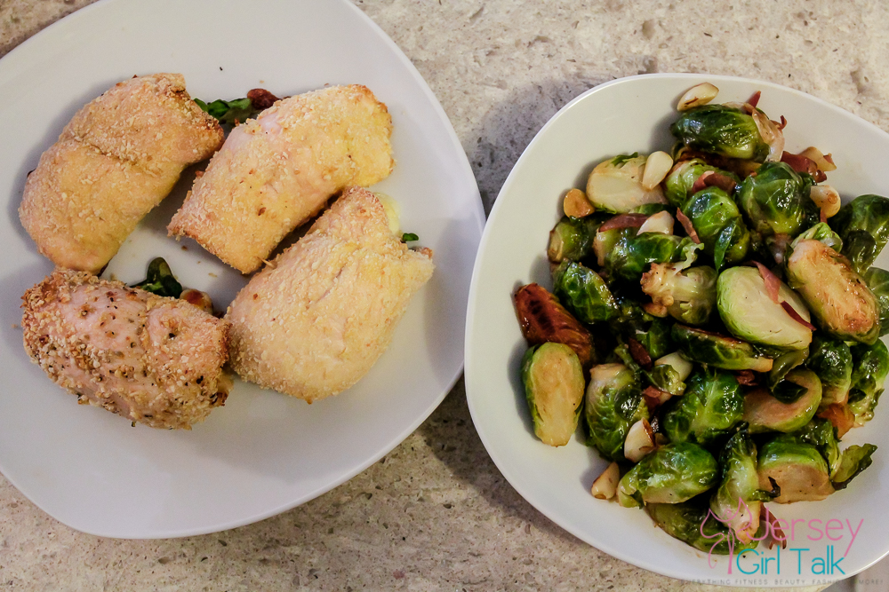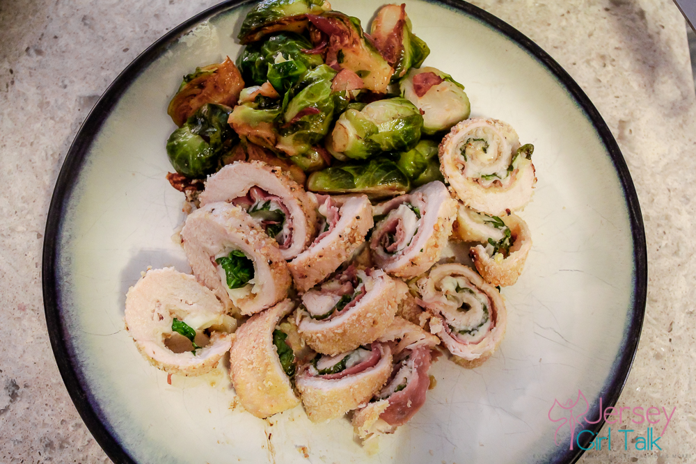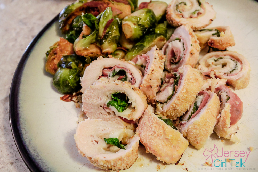 These bread crumbs are not like your typical 4C style bread crumbs we all grew up with as kids, they are not super salty and are a very crunchy texture which I loved! They cooks so well and the cheese really keeps the rollantini together so that it doesn’t become a mess when you cut it up into pieces. These are absolutely delicious and I paired this with a nice, big green salad with fresh ingredients as well as some brussel sprouts made with olive oil, garlic cloves and some sliced left over prosciutto for flavor.