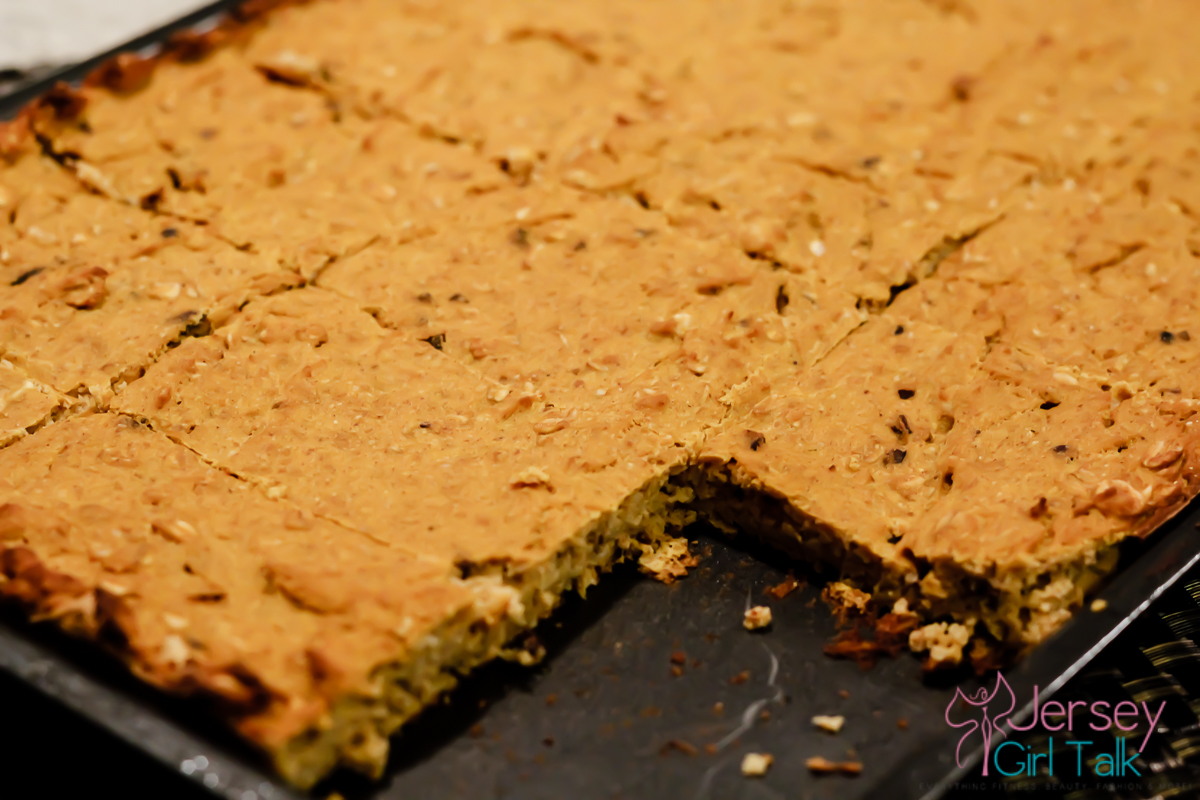 When making this recipe the first time I used a deeper baking pan, but the second time (pictured in this post) I used a flat very thin cookie sheet which was much better. You don’t want the bars to be super thick or they can be really heavy and dense. Using the cookie sheet also made the bars cook really well and be removed without falling apart.
