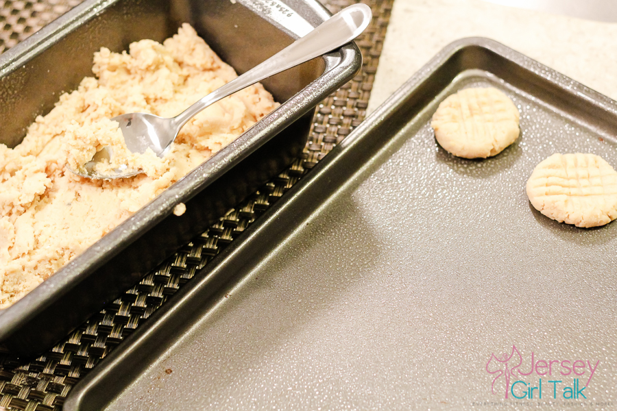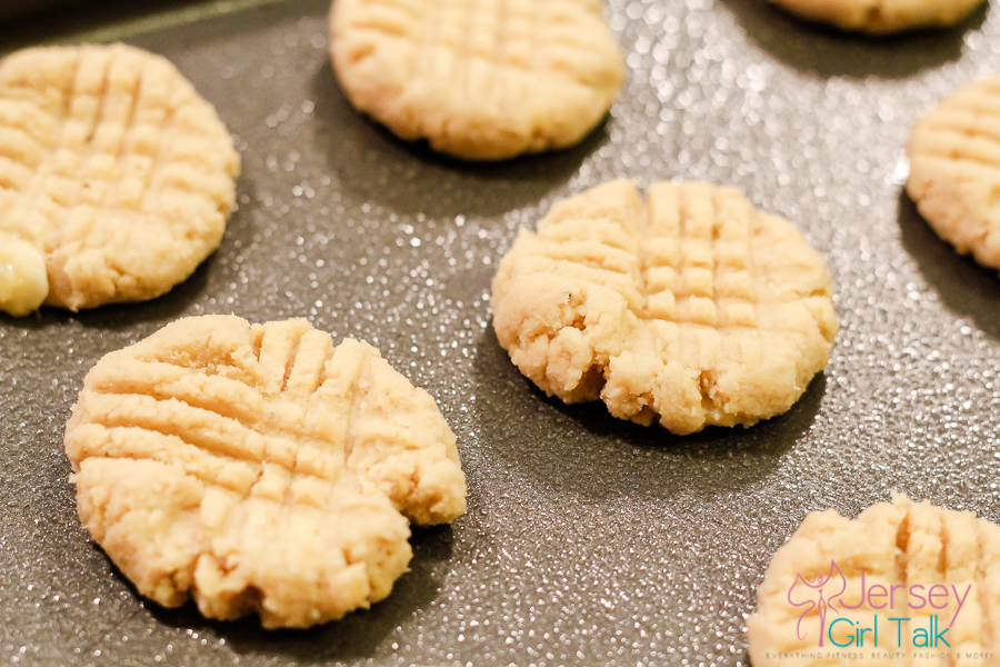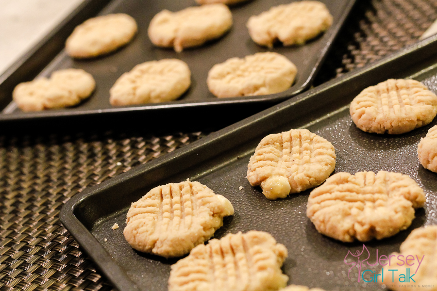 You will use a baking sheet and a spoonful of batter for each cookie, then with the back of a fork make criss cross marks to flatten the mixture. When these come out of the oven your house will also smell so yummy, which is why I love baking – the house always smells delicious!