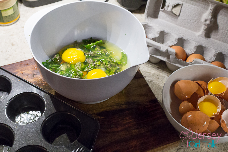 To make these put your oven on 325 degrees. In a mixing bowl add 2 whole eggs and then as many eggs as you need to fill up the number of muffin tins you have. For me I need about 2 whole eggs and 7-8 egg whites for my 6 large tins. Use your 3 seasonings to taste. Put everything in a bowl and mix it up with a whisk. Spray your muffin tins and then into the oven they go.
