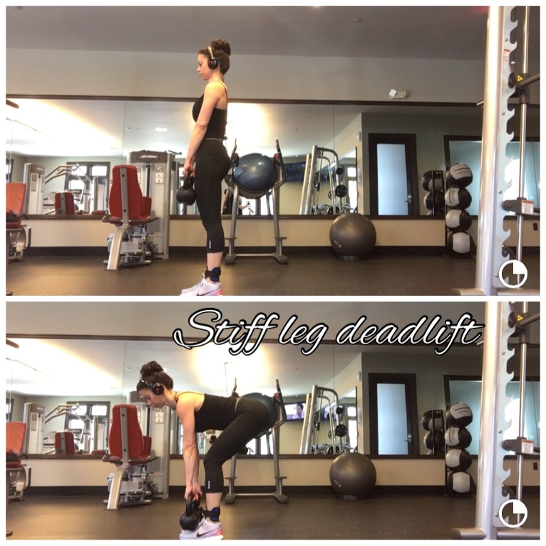 Stiff leg dead lifts with the same kettle bells – 4 sets of 15 reps