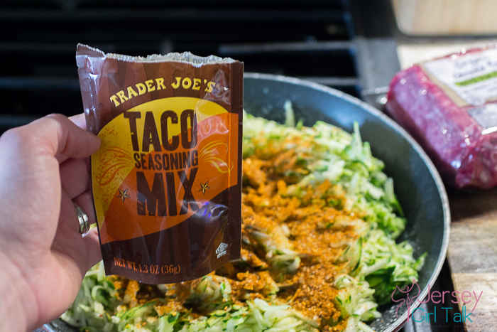 After that I added in the grass fed ground beef from Trader Joe’s which I love. I used one full packet for this meal for me and my husband. I cook that until the meat is no longer pink and then transfer into bowls.
