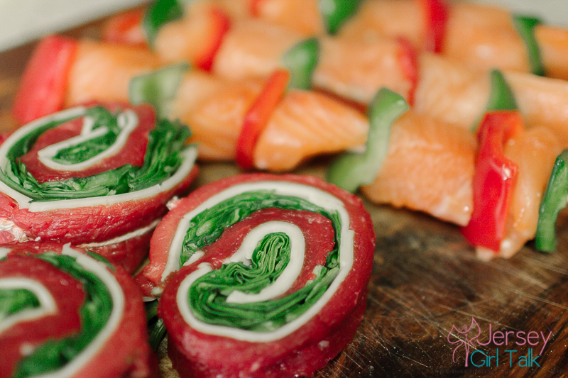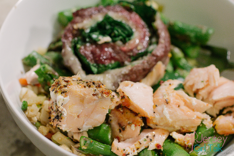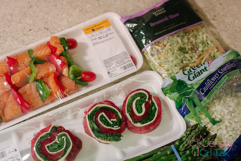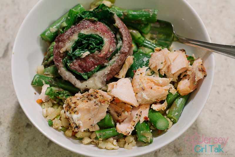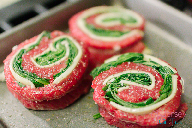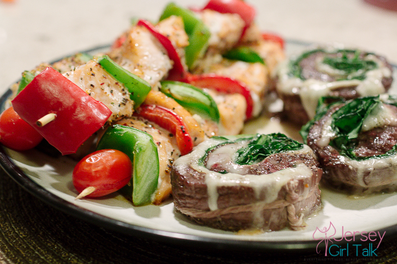 Once my salmon kabobs are seasoned and in the oven I move on to my flank steak, provolone cheese and spinach pinwheels. I also got these at the butcher counter and love how these turned out. Again I sprayed a baking pan, added some pink himalayan sea salt and pepper and then drizzled a small amount of extra virgin olive oil. I like to keep my seasoning on beef simple. I then put those in for the same amount of time as the salmon. The cheese will melt and it will be delicious!