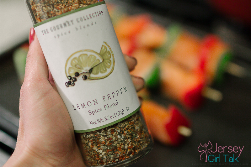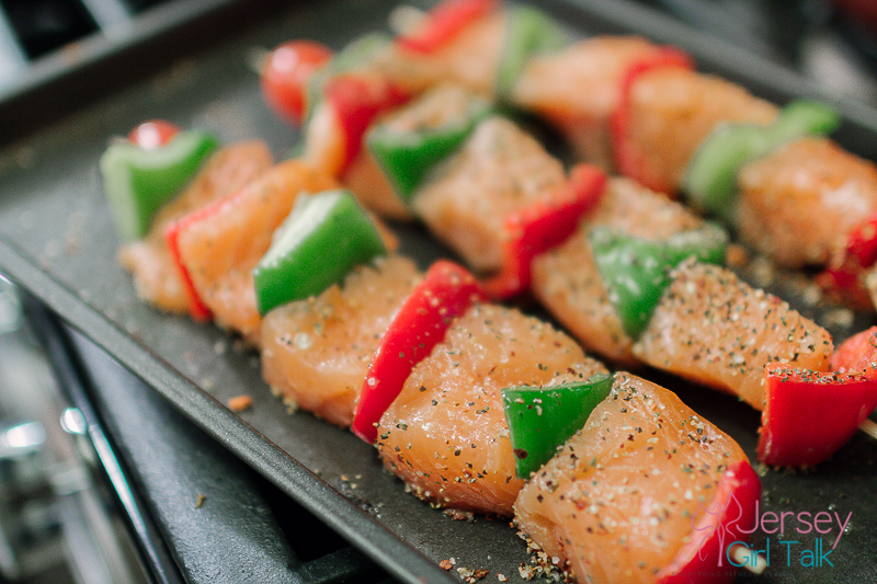 Tonight I stopped at my local Stop & Shop and picked up some fresh fish and vegetables. I love to make fish for a healthy, high protein, high fat dinner option but I can only cook it the day I buy it, otherwise to me it just doesn’t taste as fresh. I went to the fish department and got some salmon to make salmon vegetable skewers. These are really easy to prepare and cook and they taste really good too. I like to use green and red peppers, sometimes onion and then small tomato. You can use whatever vegetables you prefer. To prepare mine I set my oven to 385 degrees, sprayed a baking pan with some olive oil spray and then seasoned my skewers with Pink Himalayan sea salt and The Gourmet Collection Lemon & Pepper seasoning. I put these in the oven for 20-25 minutes to cook.
