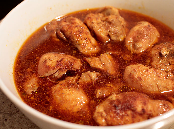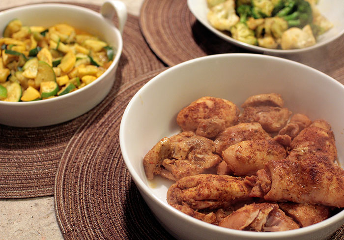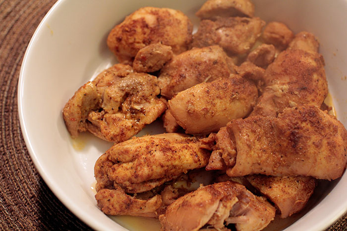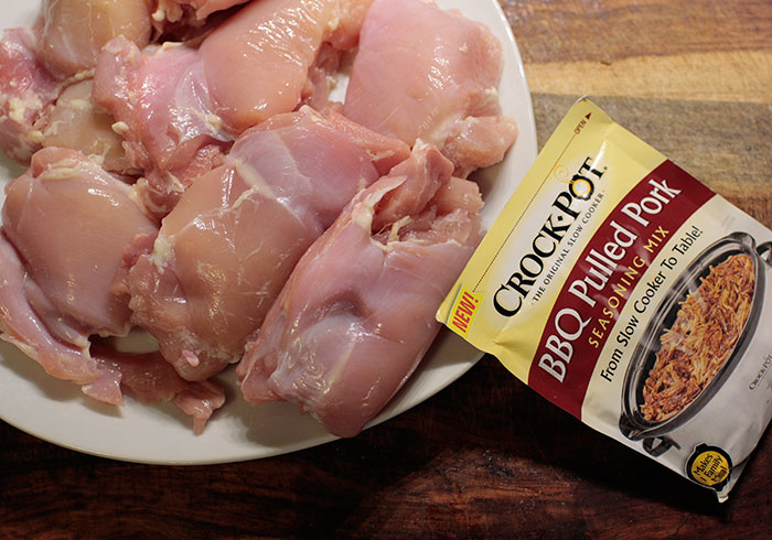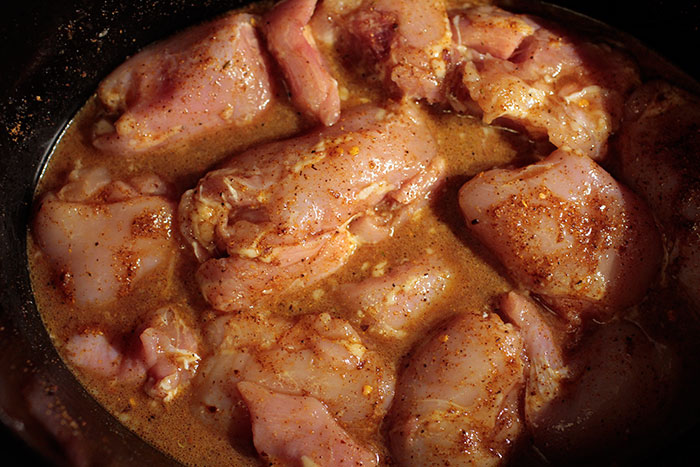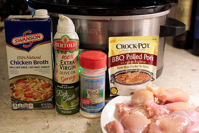 chicken but the problem is most of the marinades or sauces are loaded with sugar and carbs. Since I follow a relatively low carb diet I can’t use those, so this recipe skips the marinade and goes right for seasonings. All of these items are found in your grocery store or online. For this recipe I used organic chicken thighs which already came skinless which is a great help in preparing. I did however take some time to cut off some extra fat on the chicken to make it a bit more lean. I usually cook meals with chicken breasts which are very lean, but thighs are a bit darker meat but cooks really well in a slow cooker. Once the chicken was trimmed up nicely it was time to get my slow cooker ready.