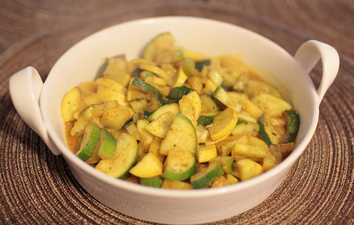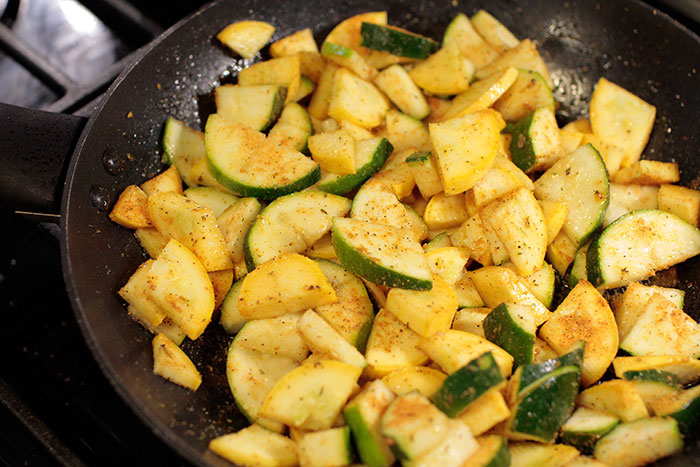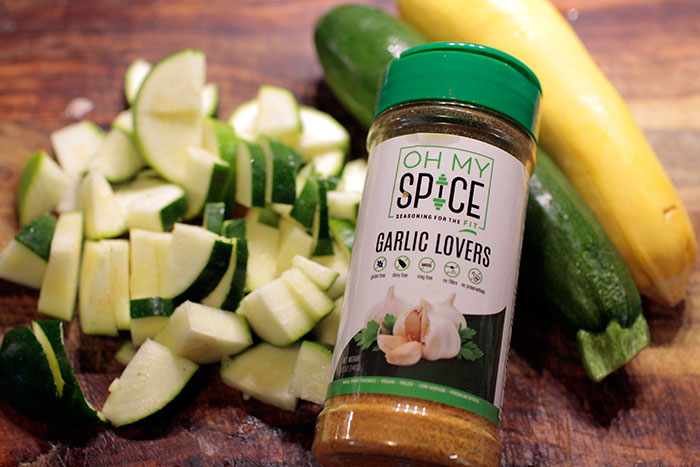 You will put the slow cooker on high for 3.5 hours or low for 5.5 which will get the chicken nice and soft and it will literally fall apart when you eat it. While that is cooking I prepared my vegetable side dishes for the night. I cut up one zucchini and one squash which I have been loving lately. I added them both to a skillet with some olive oil and Oh My Spice Garlic Lovers seasoning. When the chicken is almost done you can simmer these on low until they are soft and tasty.