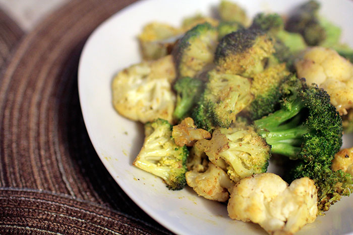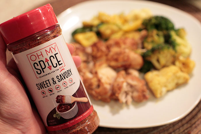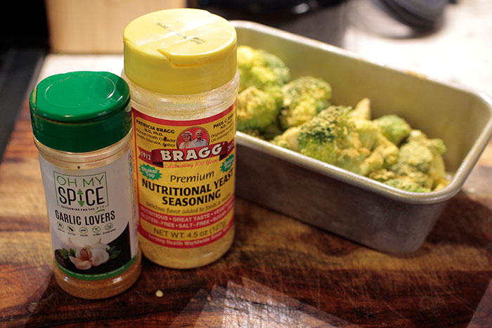 I also love making baked vegetables too so tonight I prepared some broccoli florets and cauliflower. Once they are chopped up I sprayed a small baking tin and put the oven at 385 degrees. I added some Oh My Spice Garlic Lovers on these too and dusted some Bragg’s Nutritional Yeast for a cheesy flavor. This baked in the oven for 25 minutes and I would occasionally toss the vegetables to make sure they don’t dry out.