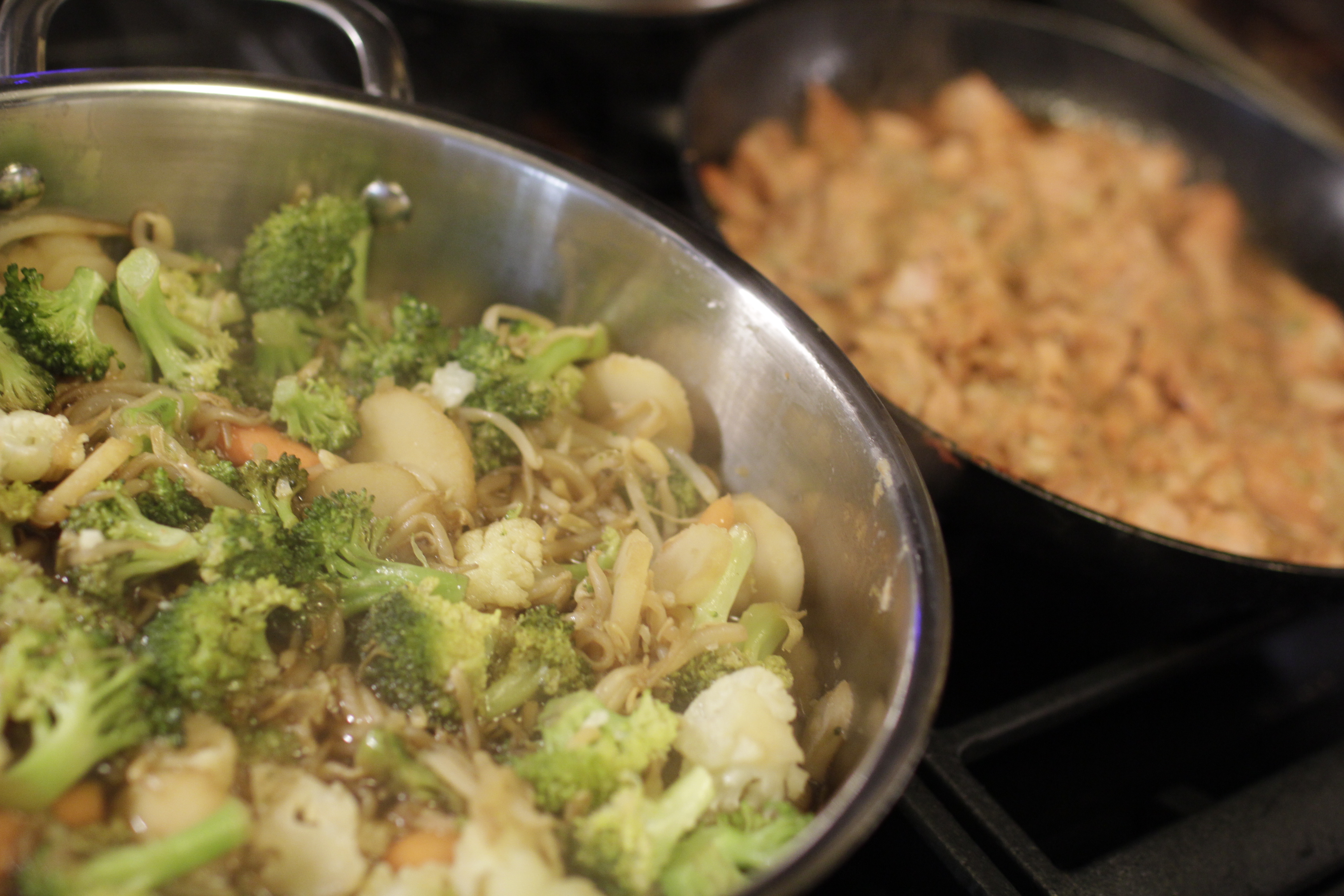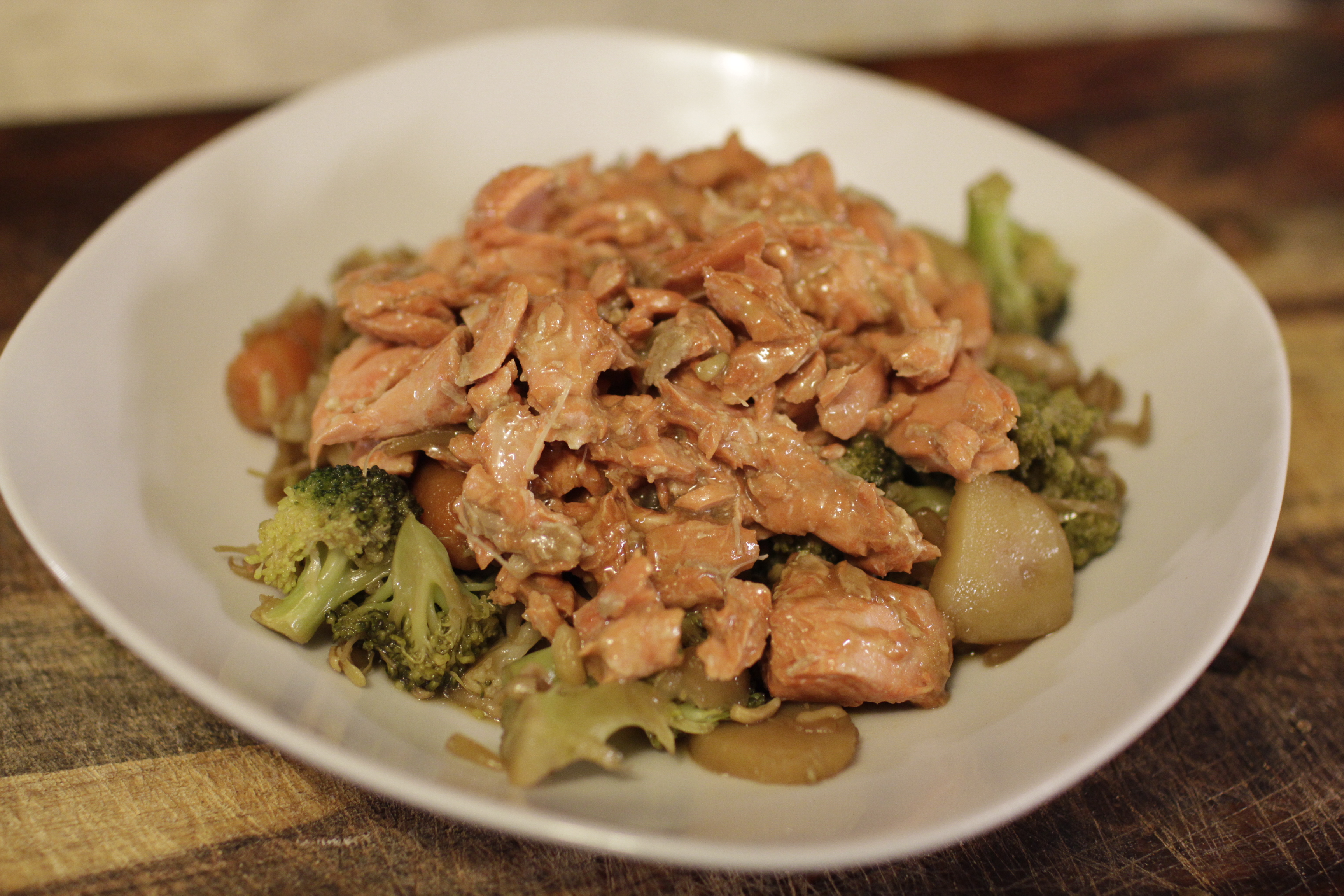 To go with the wild caught salmon I made a stir fry, almost like a low mein style dish. To do this I use water chestnuts, bean sprouts, Liquid Aminos and a broccoli, carrots and cauliflower medley. I put this all in a skillet and let simmer on a low heat for about 15 minutes. I put the salmon over this and it is one of my favorite dinner dishes!