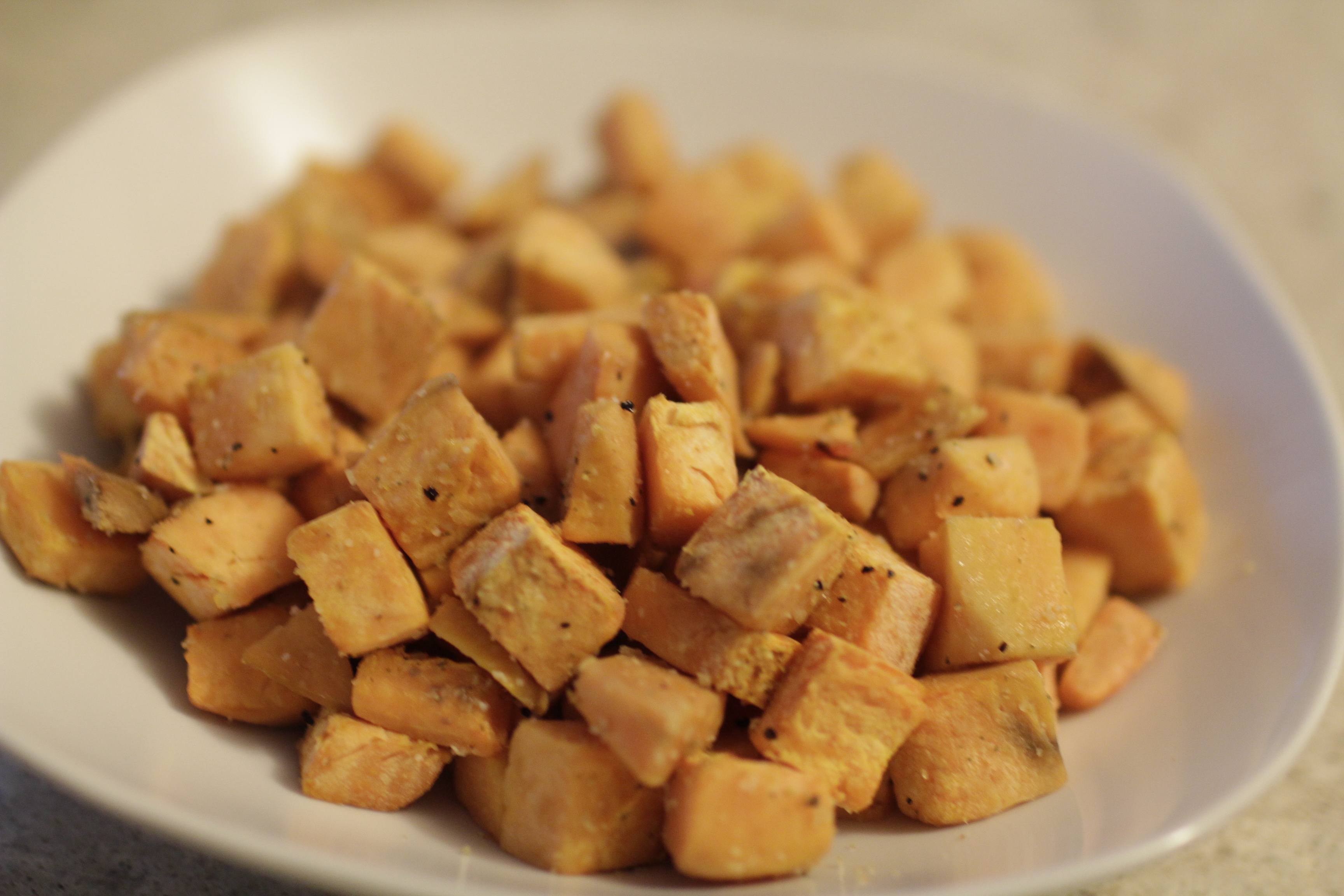 I haven’t eaten actual “carbs” in a few months but I was craving some sweet potato fries so opted to make my own version of baked sweet potato cubes in then oven. I bought these diced potatoes and then sprayed a baking sheet with coconut oil. I also sprayed the potatoes and then sprinkled some organic garlic salt and Oh My Spice Garlic Lovers all over. I then mixed them around to get them nice and coated and put in the oven at 385 degrees for 30 minutes. They came out absolutely delicious!
